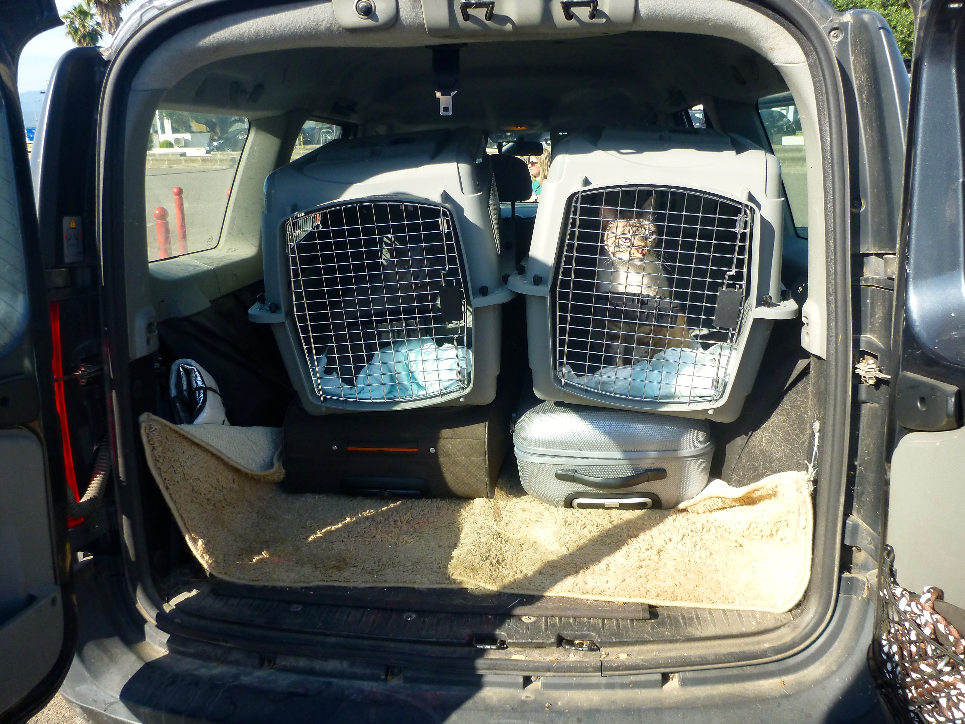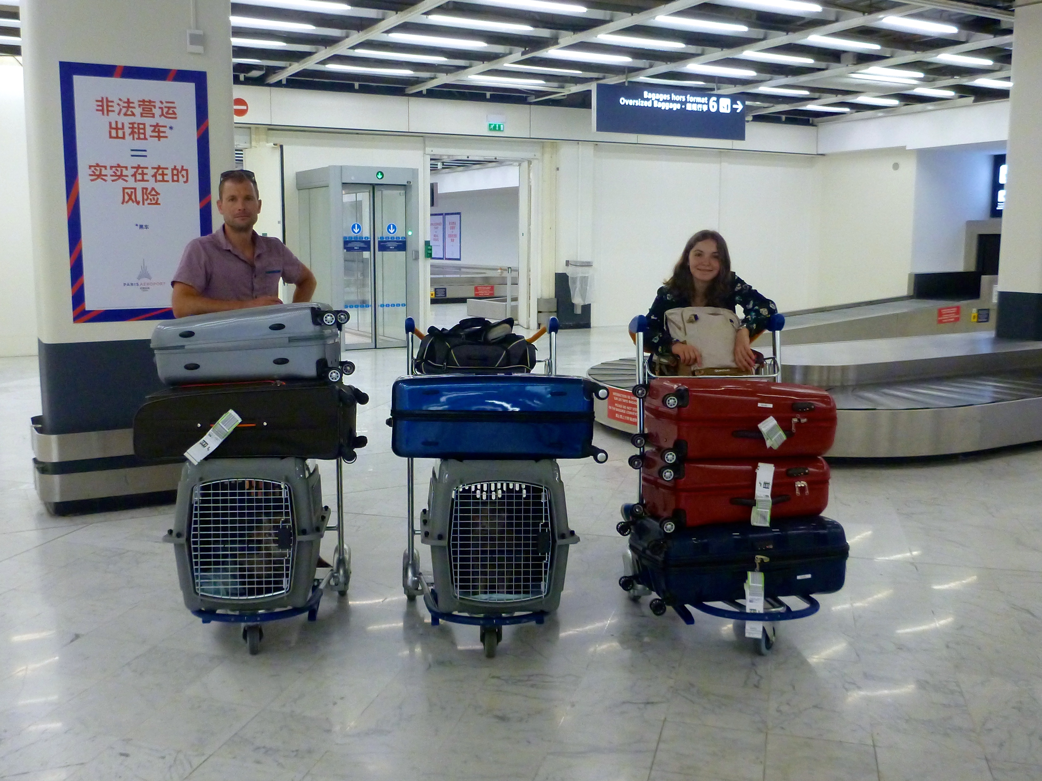 Nous attendons avec impatience les chats. Ils arrivent très vite et semblent avoir bien supporté le vol. Nous leur donnons de l’eau, les rassurons comme nous pouvons et filons vers la sortie retrouver mon oncle.