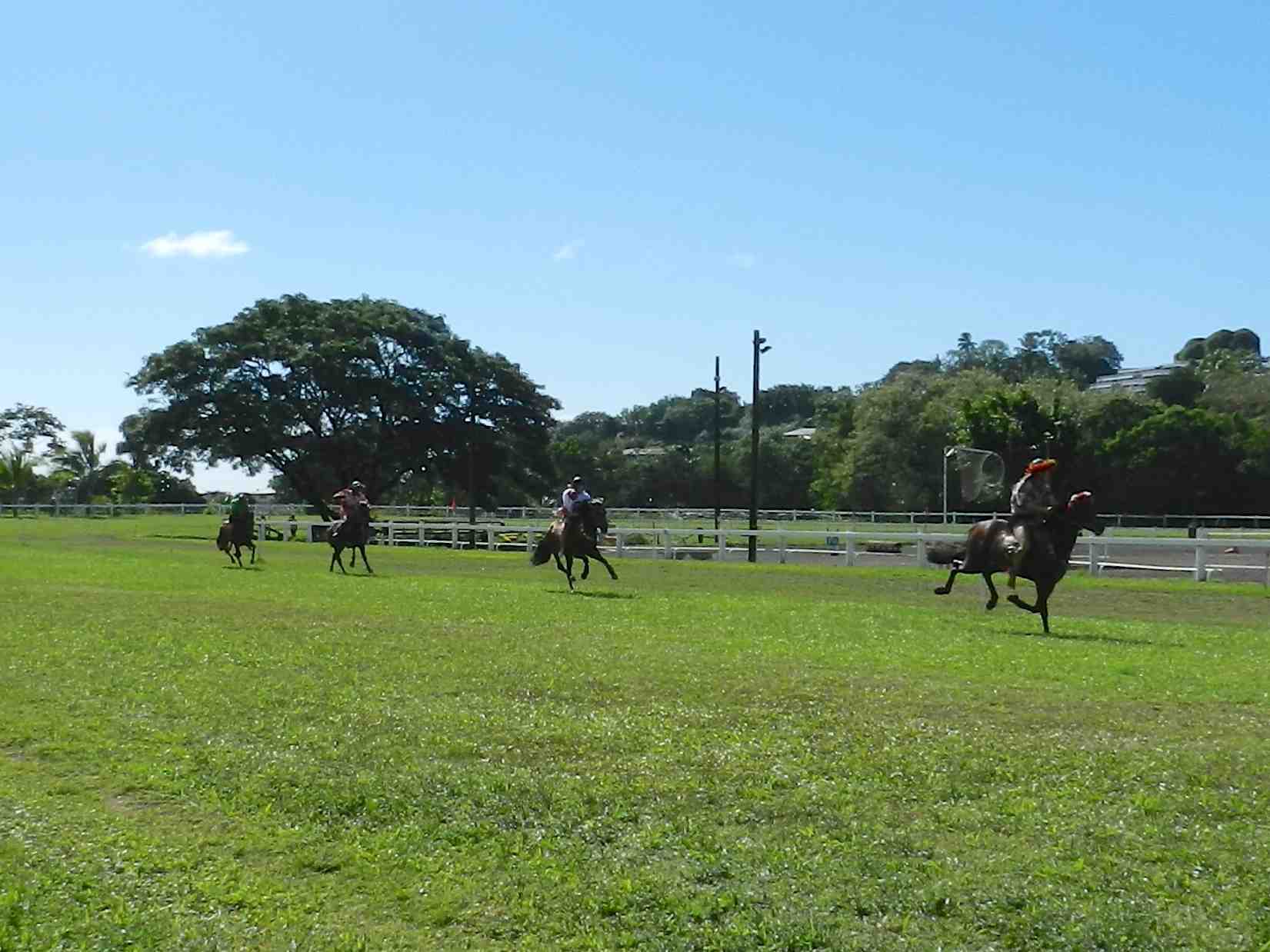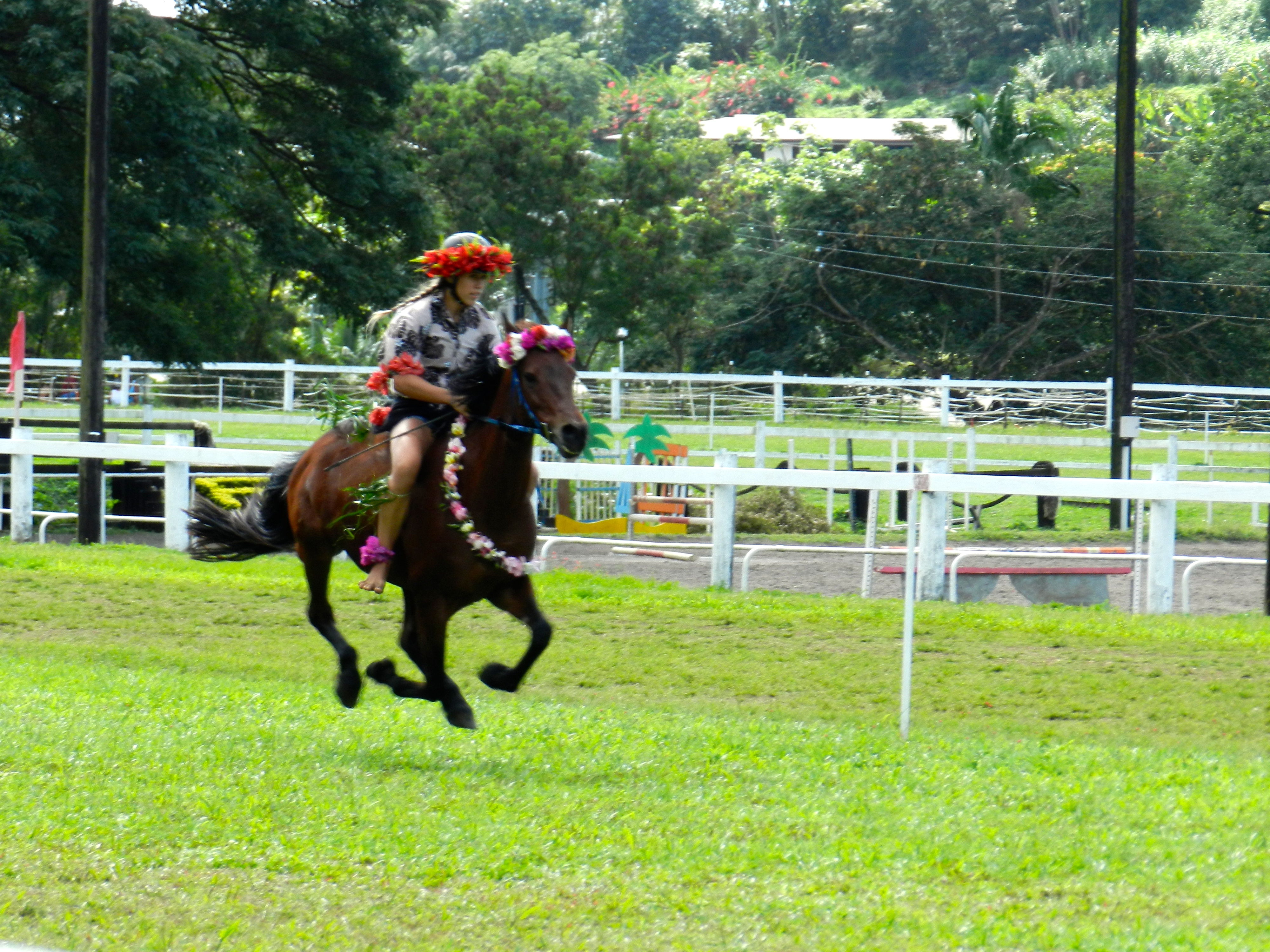 Le 21/07 Nous avons eu l’occasion d’assister à une course traditionnelle de galop sans selle et en Pareu (paréo), puis à différentes démonstrations, de trot attelé, d’amble… Cette course fait partie du fameux Heiva (festivités du 14 juillet). Elle était l’attraction qu’il ne fallait manquer sous aucun prétexte. l’évènement avait lieu sur la plage de Taaone jusqu’en 1859, avant la construction du premier hippodrome. Pour cette épreuve, les chevaux sont des marquisiens nés à Tahiti. Pour le trop ou d’amble, se sont des chevaux importés d’Australie ou de Nouvelle Zélande.
