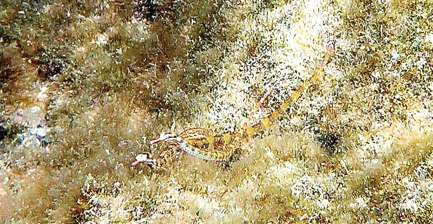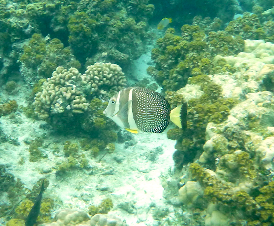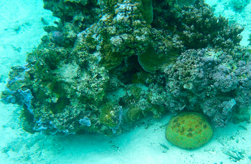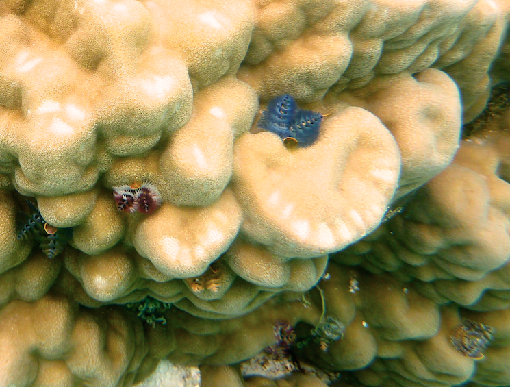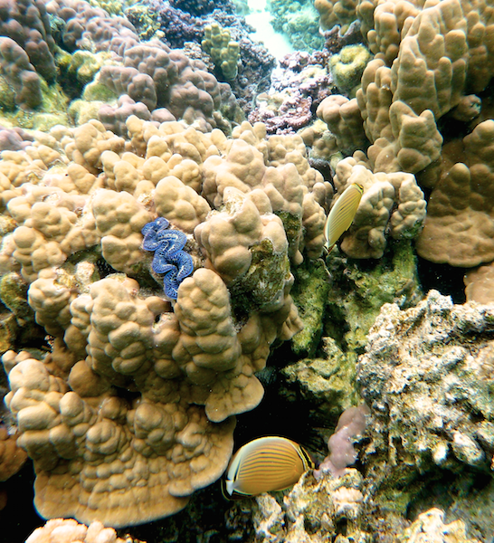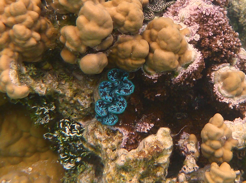 Quelques photos poissons que nous ne croisons pas souvent sur Tahiti. Vous trouverez la première photo floue. Elle représente une espèce proche de l’hippocampe, nommée « Corythoichthys Flavofasciatus ». Aussi simple à photographier qu’à prononcer ! Dans le genre bizarre, en dessous, vous trouverez des sortes de petits sapins de couleur. Ce sont en réalité des vers Spirobranchus. Puis une sorte d’étoile de mer bien ronde, un coquillage « Sept-doigts », un bénitier Bleu, quelques coraux et poissons. Sinon, je me suis fait une frayeur quand un requin a surgi de sa cachette, entre deux patates de corail. Sorti du rendez-vous organisé, ça fait drôle d’en croiser un en mode chasseur !