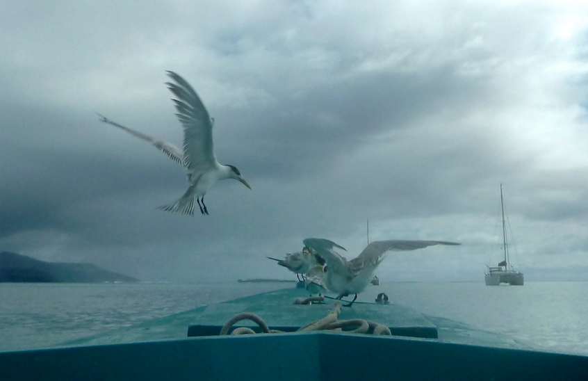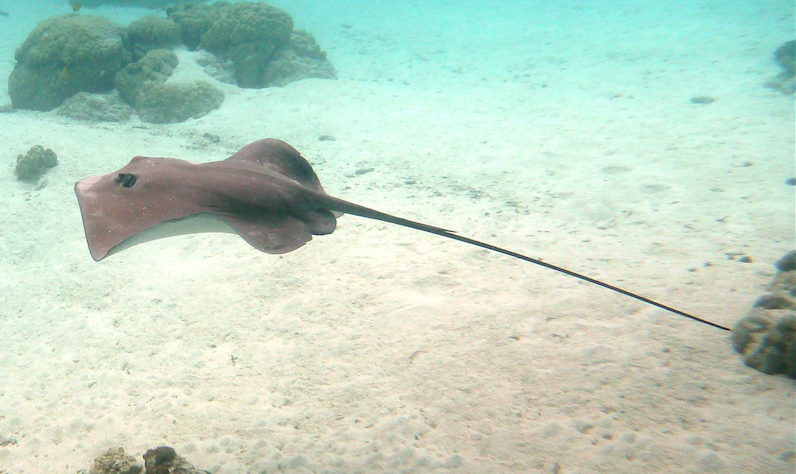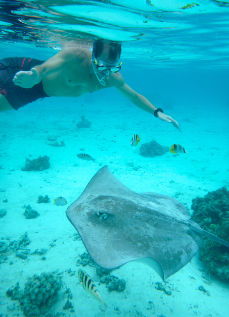 Le temps se gâte et nous essuyons notre première averse. De nouveau sur le bateau, on se dirige vers une « passe » où nous allons nous laisser dériver par le courant. La sensation d’être sur un tapis roulant est super sympa ;). Notre guide, équipé de bananes, nous invite à nourrir quelques poissons « papillons à deux selles ». Au retour, notre copine « Raie » vient nous dire au revoir en réclamant quelques câlins mais espère une petite récompense pour le déplacement. Ça nous aurait presque fait oublier nos affaires mouillées sur le bateau… Impossible de faire sécher la moindre serviette pendant la journée et notre sac a fini par prendre l’eau. Rien de grave, ce n’est que du confort. Ces souvenirs valent bien quelques minutes de chaire de poule !