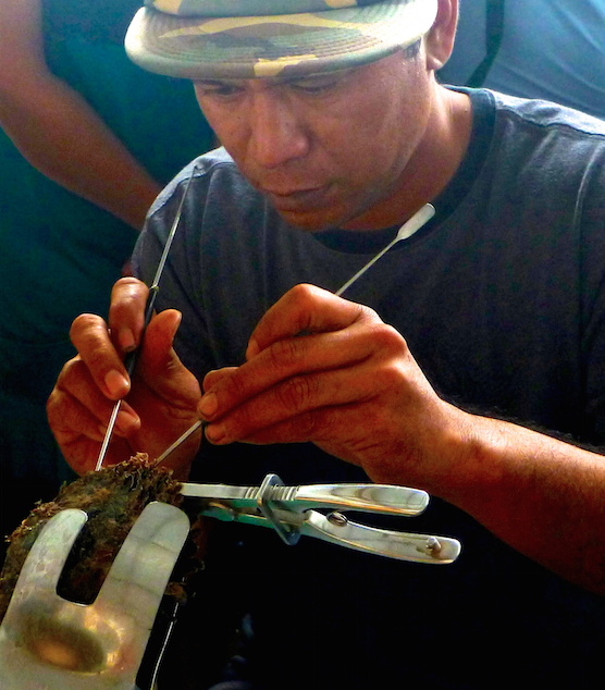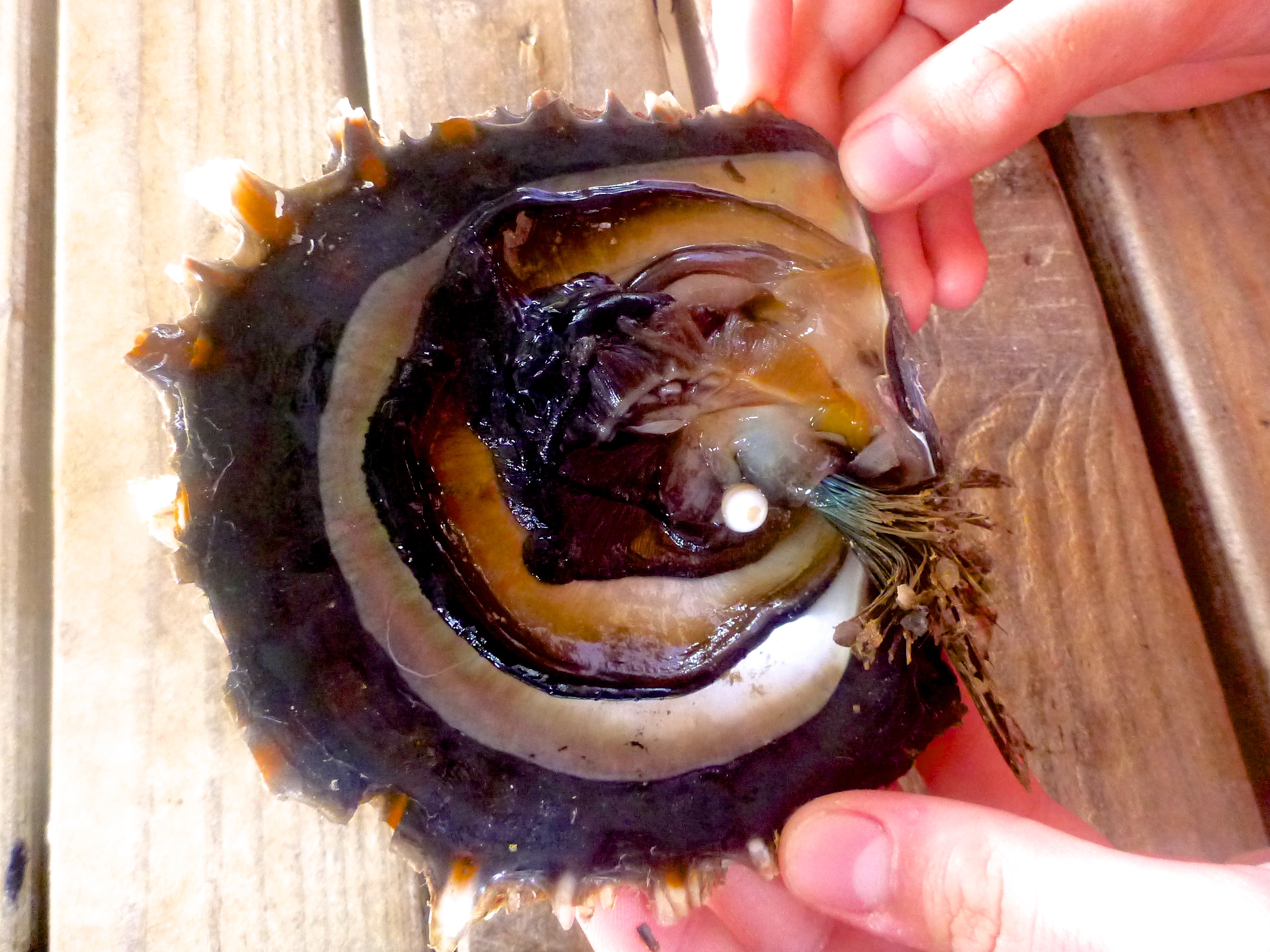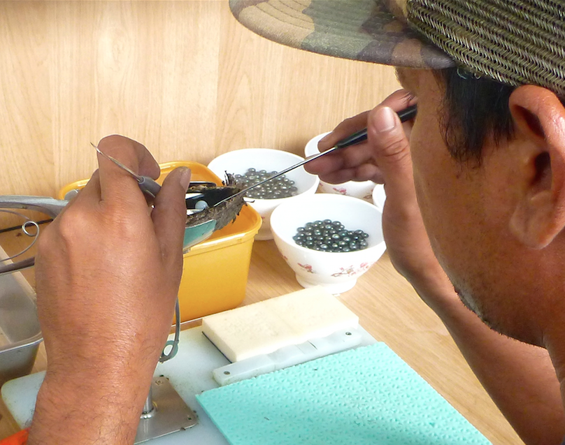 À peine le temps de digérer, on part direction une ferme perlière. Après avoir visiter la nurserie des futures huîtres (jusqu’à 3 ans), nous assistons à la récolte des perles et à la greffe d’un nouveau nucleus. Une huître peu fabriquer jusqu’à 3 perles. Après avoir incisé la « Gonade » (glande sexuelle), on introduit un nucleus (perle de nacre faite à partir d’une coquille de moule du Mississippi) et un fragment du manteau d’une autre huître « sacrifiée » pour son ADN. La nouvelle récolte aura lieu dans 18 mois. L’opération, extrêmement rapide, demande minutie et concentration.
