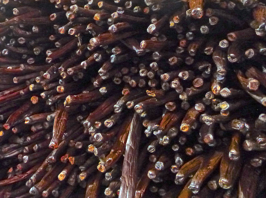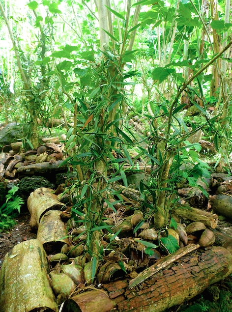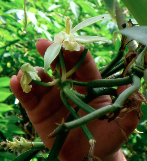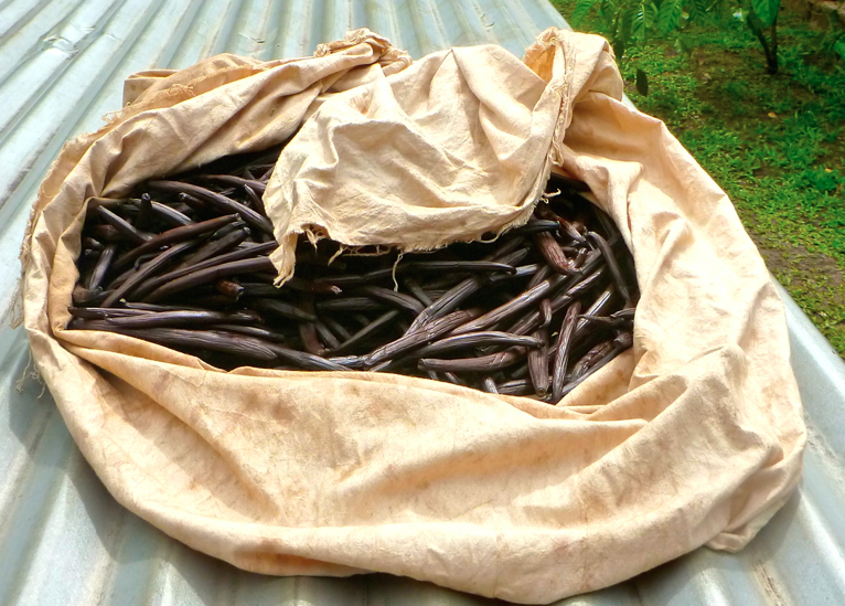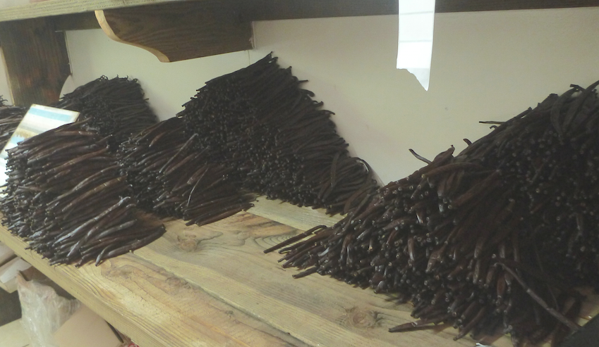Nous avons eu le droit à un véritable cours sur la culture de la Vanilla Tahitensis et sa pollinisation. À la différence Comme la vanille Bourbon, cette variété d’Orchidée, est hermaphrodite. Il est possible de la ramasser à maturité car sa gousse ne s’ouvre pas. Elle sera ensuite étalée, au soleil sur des linges, quelques heures par jour pendant plusieurs semaines. Cela intercalé de séance de massage, gousse par gousse afin de répartir les grains et la conserver souple. Un travail de petite fourmi. Parlons budget maintenant… Cette variété est considérée comme la vanille des grands chefs et son prix avoisine les 500€/kg… Ce qui en fait l’épice la plus cher après le safran ! Cependant, elle est tellement concentrée, qu’il n’en faut qu’un quart pour parfumer un plat. Moi, je serais bien repartie avec le p’tit baluchon…