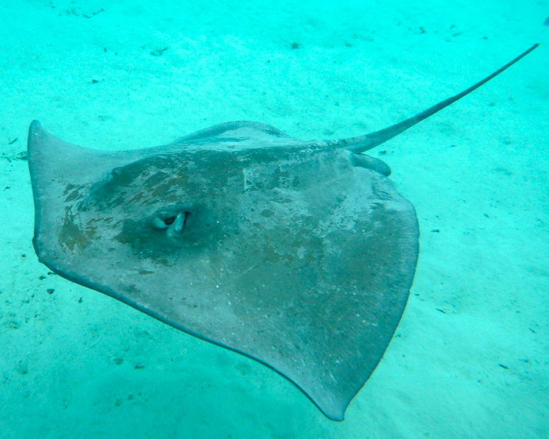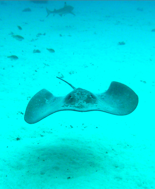 Attirée par l’animation dans cette partie du lagon, une Raie Armée vient nous saluer, puis se prend d’amour pour Naïs. Impossible de résister à cet animal majestueux.