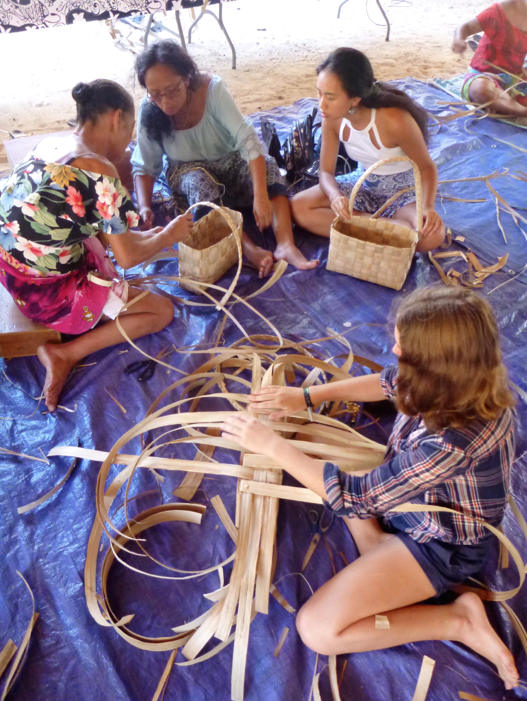 Nous avons commencé par la anse. Notre « Tatie Tahia » nous explique que c’est le plus laborieux. Et on confirme ! Après avoir tressé mon mètre réglementaire, « Mama Fabiola » remarque une erreur à 10cm. Je me retrouve à devoir tout recommencer, bien dégoutée ! De son côté, Naïs n’avance pas une cacahuète 😉 Nous ne sommes franchement pas douées (ce qui ne nous empêche pas d’être hyper motivées). On redemande des infos, récupère des feuilles de Pae’Ore et on emporte du travail pour la maison. Faut rien lâcher !