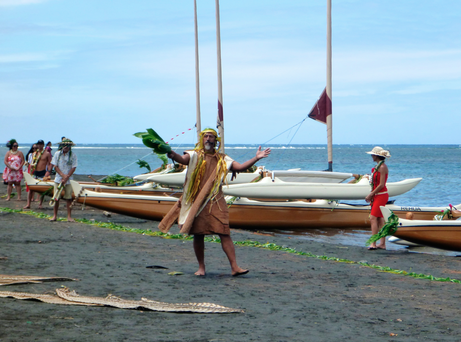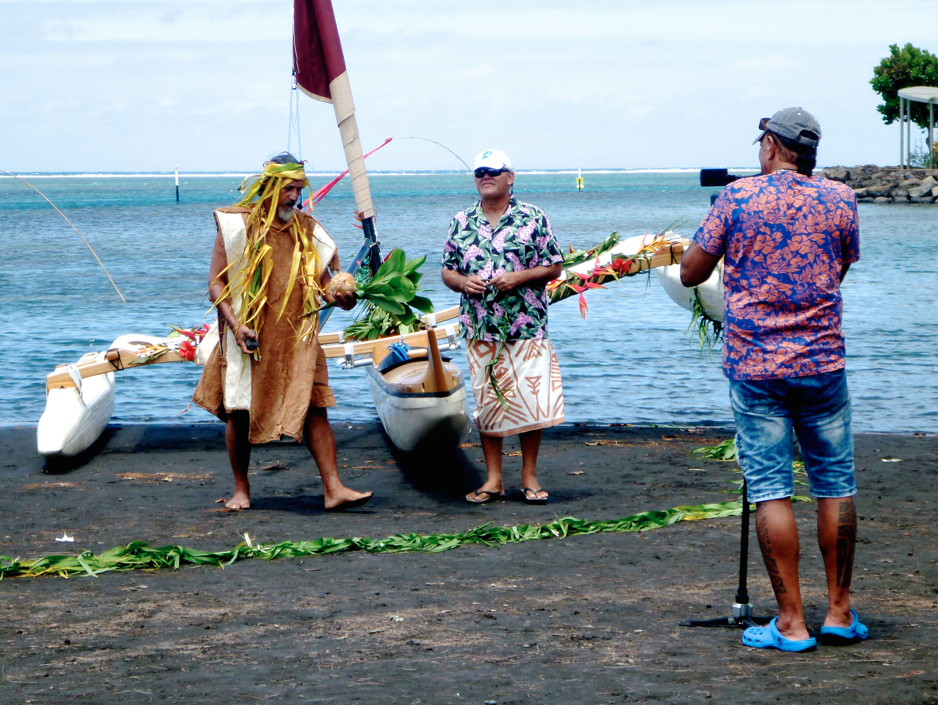 Avec la pointe de Vénus comme écrin, cette cérémonie traditionnelle « Fa’ainura’a va’a » est orchestrée par « Le sorcier » (Tahu’a) Sunny Moana’Ure Walker. Une ambiance mystique flotte sur la plage lorsqu’il invoque la protection des Dieux. À la place d’une bouteille de vin brisée sur la coque, Sunny ouvre une coco. Son eau est versée sur le bateau et bue par la marraine ou le parrain de chaque navire.