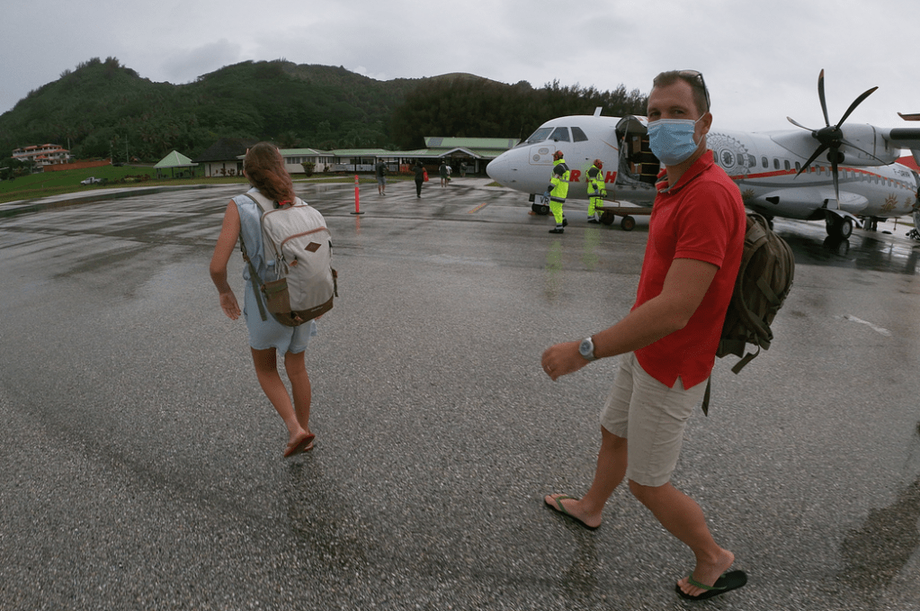 Malgré une organisation chaotique, nous posons les valises sur Rurutu pour 6 jours. Masques obligatoires pendant le vol pour cause de 2nd vague de Covid… et petite pluie fine à l’arrivée enfin ça, ça ne devrait pas durer !