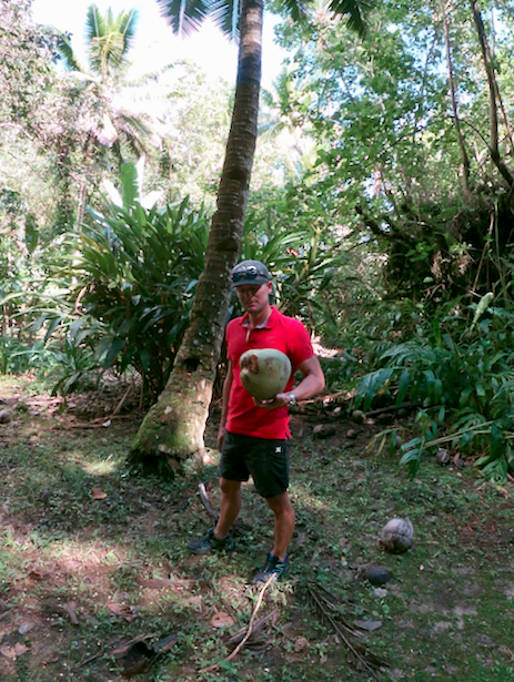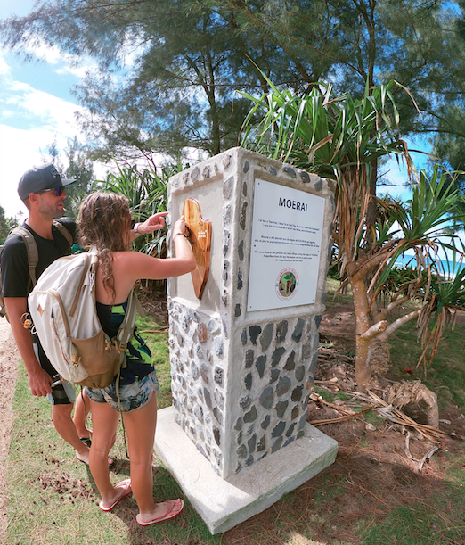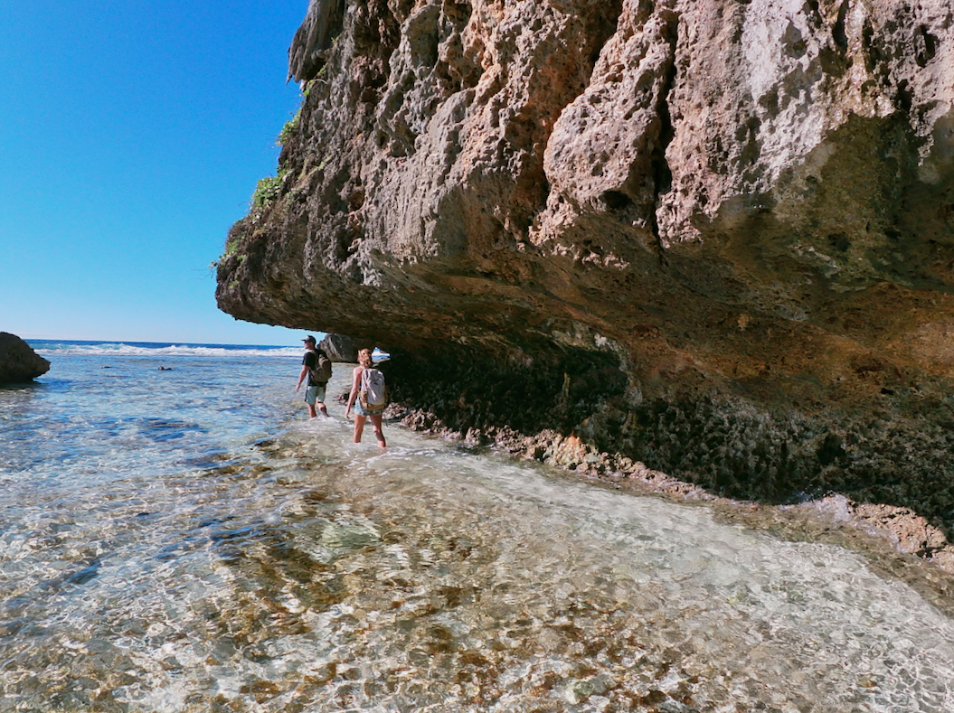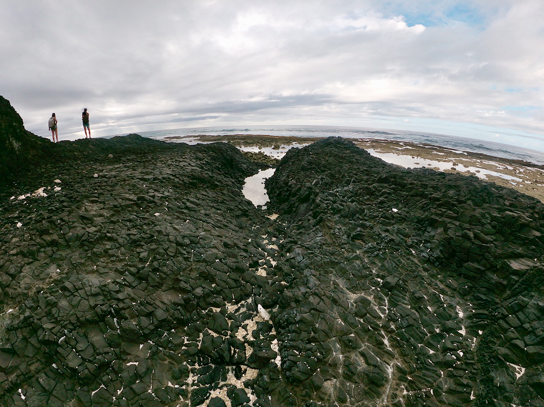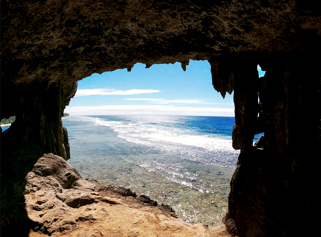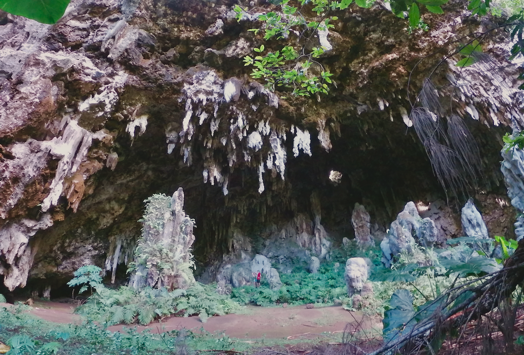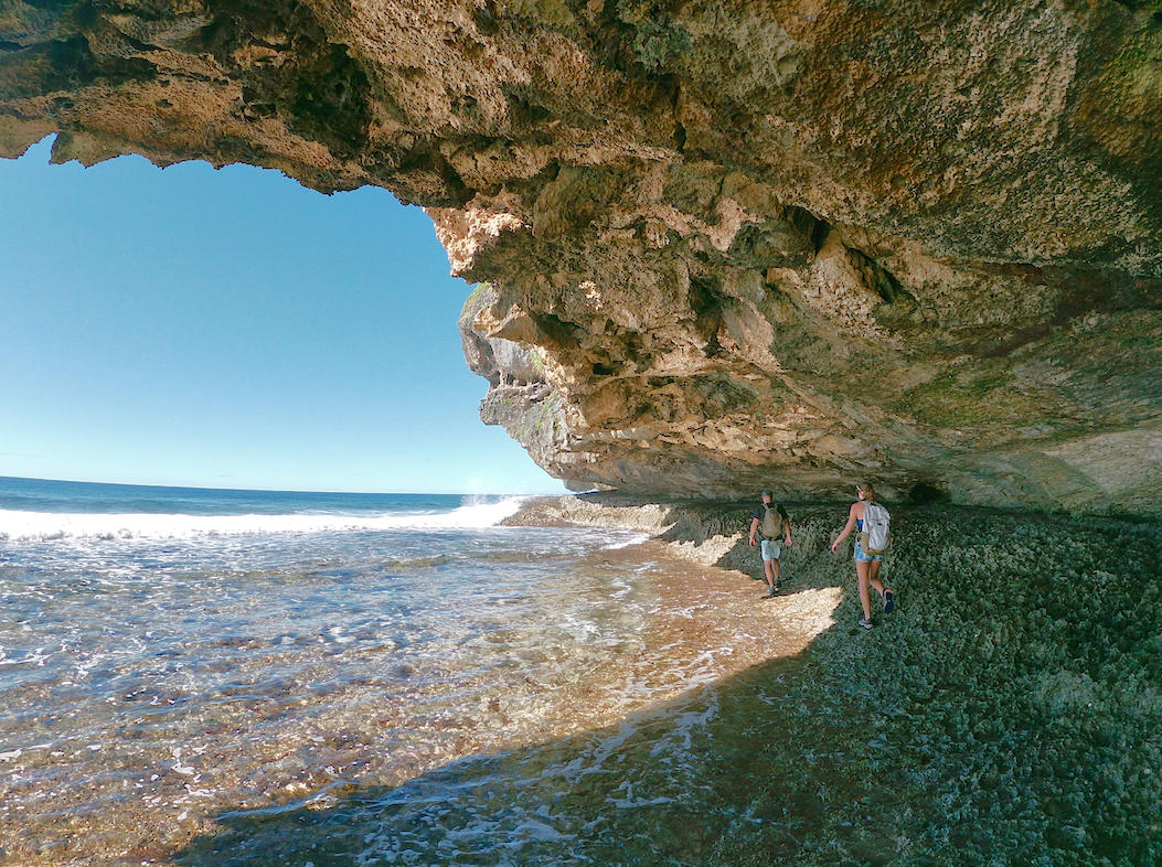 Comme un témoin de la résurrection de Rurutu, un monstre, accroché à la falaise Toarutu, gueule entre ouverte, semble menacer les assauts de l’océan. Stalactites et stalagmites semblent soutenir l’énorme mâchoire (on peu voir Pierre, tout petit à l’intérieur). On découvre la bête, en empruntant un sentier dont le nom seul est plein de promesses : « le sentier oublié ». Nous commençons l’approche par la plage et nous retrouvons rapidement sur la « râpe à fromage ». Un pan de corail exondé rappelant l’ustensile de cuisine. Prudence aux vagues et aux marées !