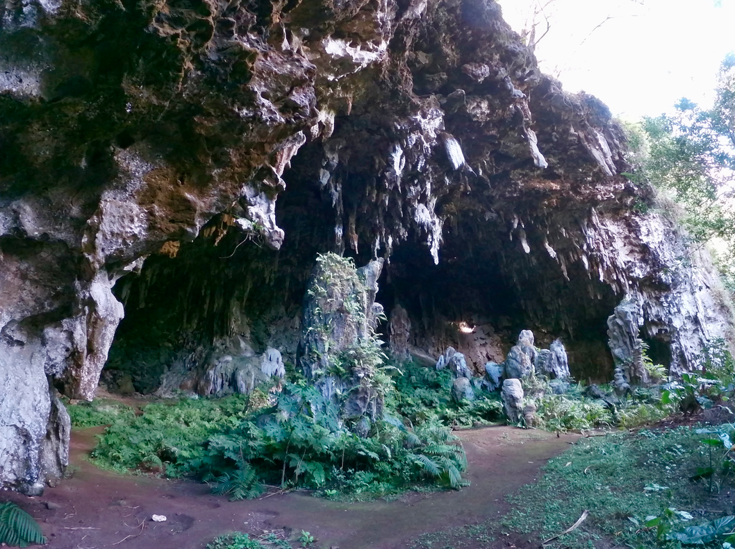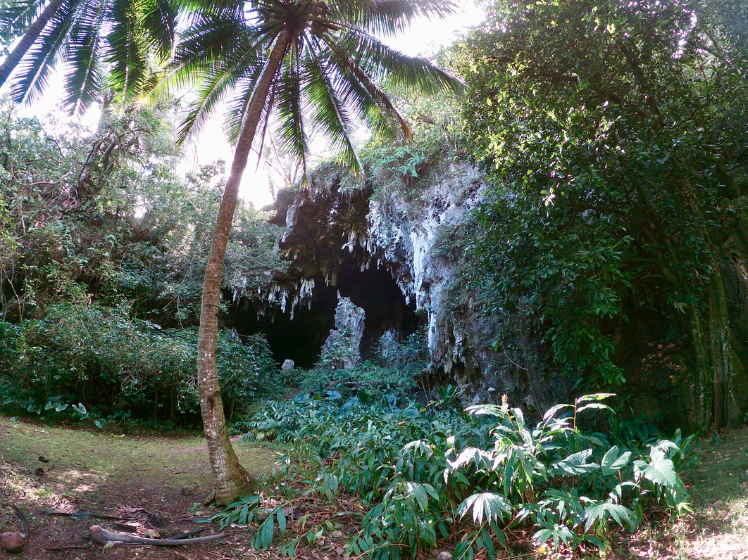 Il n’y a pas de vols ce jour, nous pouvons rentrer à la pension par la plage en longeant la piste de l’aéroport. Cela nous permet de passer par un point d’observation des baleines, le rocher du chien, une coulée de lave et une autre grotte : Ana Taneuapoto, du nom du guerrier qui y vivait. Pour l’anecdote… Tane-Ua-Poto peut se traduire de deux façons : « L’homme qui se protège d’une averse » ou « L’homme à la verge courte ». C’est quand même pas la même affaire 😉 On nous explique qu’il ne reste pas grand chose de cette grotte. Les légionnaires ont dynamité une partie de la falaise afin de réparer les routes endommagées par le cyclone « Peni » en 1980. La cavité vaut tout de même le détour. La colonne de l’entrée est tout simplement gigantesque !