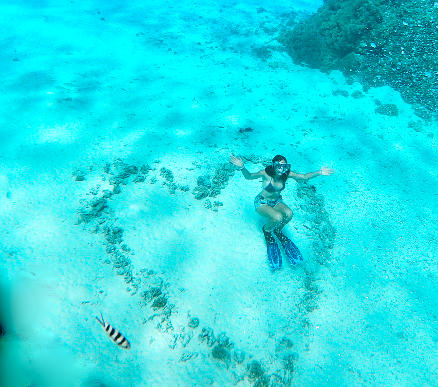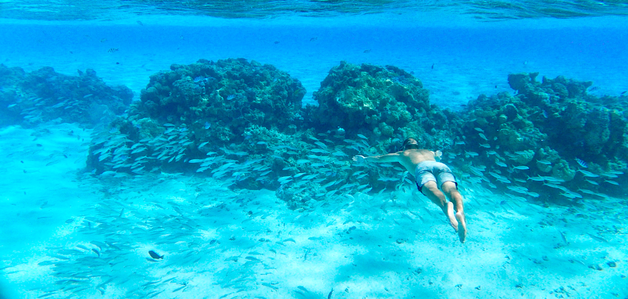 Quelques palaces plus loin, nous arrivons sur un groupe de Motus ayant appartenu à l’explorateur Paul-Emile Victor. Motu Tane a été racheté par François Nars (Nars cosmetics), L’accès y est interdit. Nous nous rendons sur Motu Haapiti et visitons un superbe jardin de corail. Nous croisons un immense banc de poissons chirurgiens bagnards, une raie léopard, des poissons coffres et des Bénitiers aux couleurs variées. Je comprends pourquoi Paul-Emile a souhaité finir sa vie dans ce lieu calme, au climat doux. Loin de l’agitation parisienne ou du froid de ses terres d’explorations.