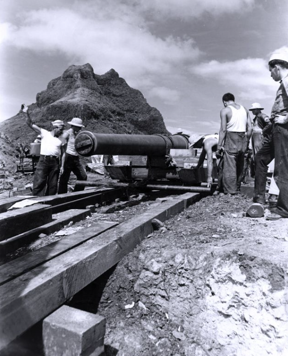 Alors que cette petite île compte à peine plus de 1000 habitants, le 17 février 1942, environ 4600 GI’s débarquent d’une flotte impressionnante, partie un mois plus tôt de Charleston. Des travaux d’infrastructure sont immédiatement engagés : installation de 8 canons de 7 pouces et des batteries anti-aériennes (DCA), établissement de la route de ceinture, captage d’eau, usine électrique, quais, piste d’atterrissage… Bora Bora fut longtemps la seule île de Polynésie a avoir une piste permettant l’atterrissage de gros porteurs (premier vol officiel à Bora Bora 1943 contre 1961 pour Tahiti). Bobcat en chiffres : 1941 à 1946, 1200 navires y ont accosté, déchargé près de 50 000 tonnes de fret, 45 y ont été réparés pour de lourdes avaries, de nombreux autres ont été ravitaillés en eaux douce et essence et plus de 20 000 hommes y ont débarqué.