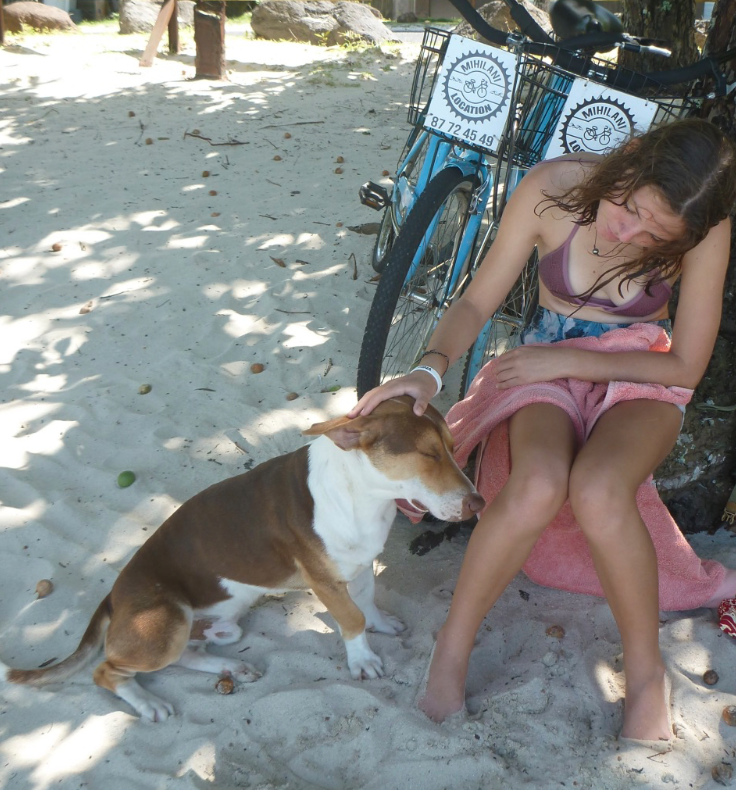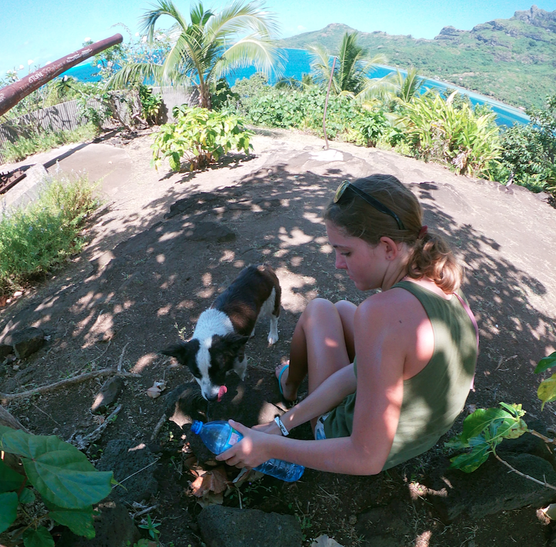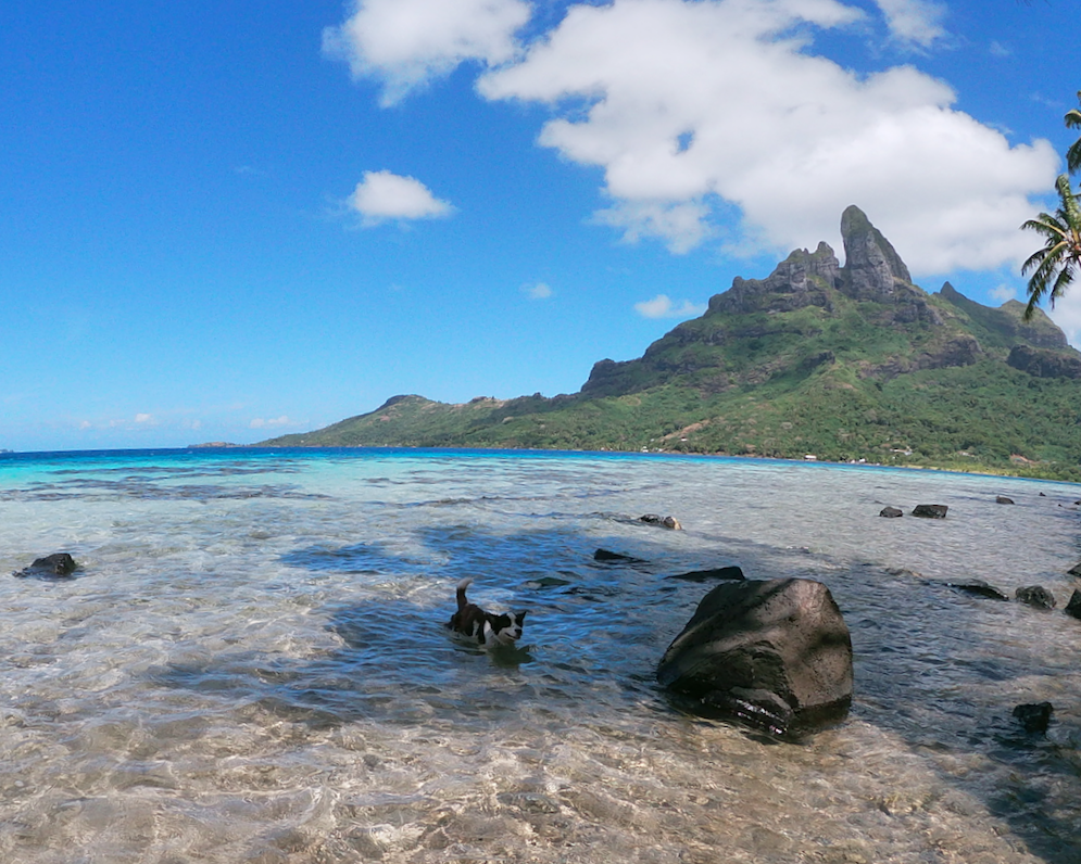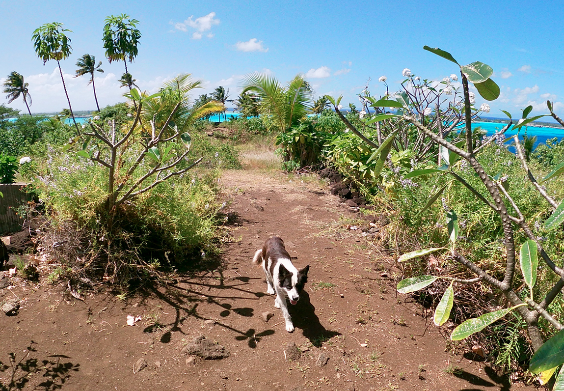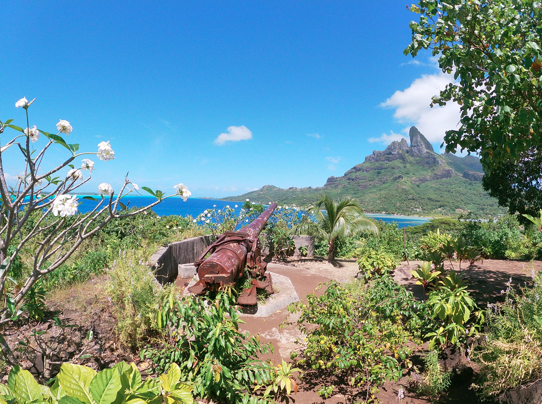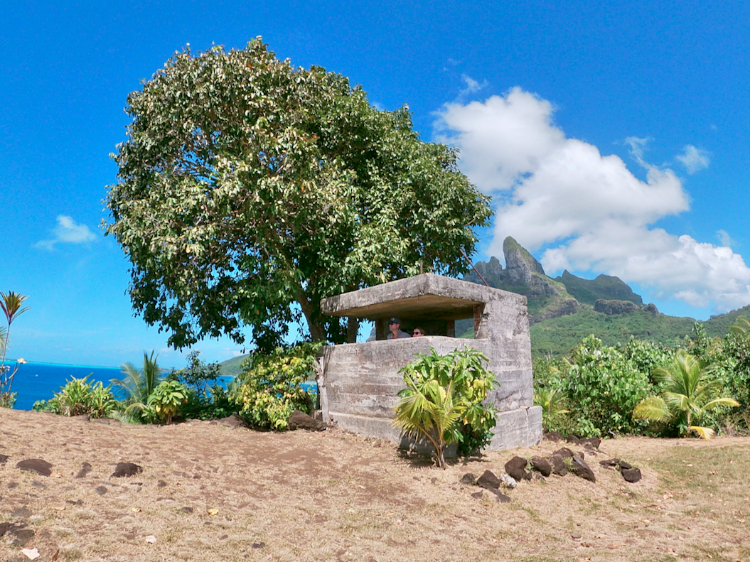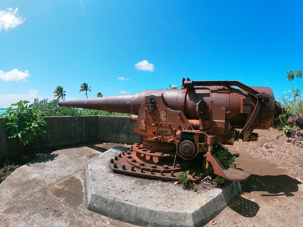 Bien trop curieux, nous sommes allés voir ces fameux vestiges. Les 8 canons et quelques bunkers sont encore visibles, de même que le quai de déchargement de Farepiti et bien entendu, la piste de l’aéroport. Nous empruntons trois vélos et hop, direction la pointe Tuiahora en face de l’hôtel 5* Le St Régis… La vue doit être pas mal ! Accueillis par la propriétaire du terrain, elle nous apprend qu’il y a également un accès à une petite plage. On ne va pas s’en priver ! Nous récupérons notre guide (le chien de la famille), entamons une courte balade et arrivons au bunker puis aux deux canons. La vue est imprenable. Après quelques rafraichissements bien mérités, ce brave guide nous conduit directement dans le lagon, où il semble avoir ses habitudes 😉