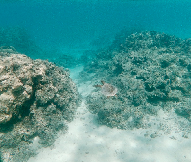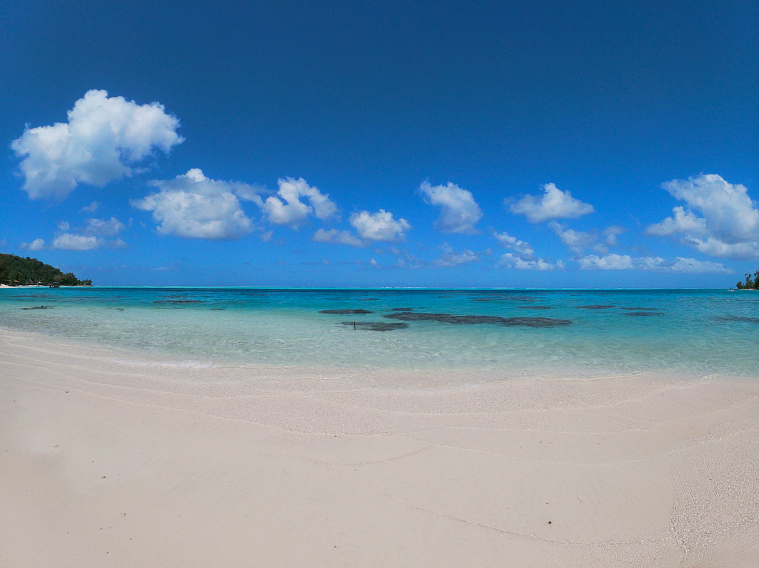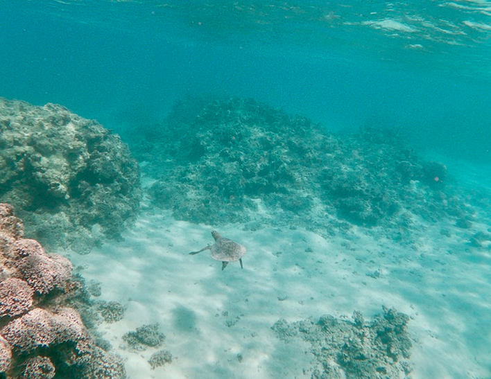 La réputation de la plage de Matira en faisait un passage obligatoire. En même temps, elle n’a pas de concurrence sur l’île principale. C’est l’unique plage publique. Elle est magnifique, cependant le corail n’est pas en pleine forme… Nous avons été déçus jusqu’au passage d’une tortue. Une belle tortue imbriquée réfugiée dans le lagon car malheureusement blessée. Elle a certainement croisé la route d’un requin et y a laissé une nageoire. J’ai bien sûr fait un signalement à l’association malgré la qualité des photos… Je ne voulais pas la faire fuir mais prendre une photo d’aussi loin ça ne donne pas grand chose d’exploitable.