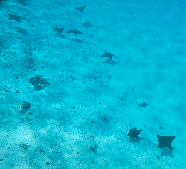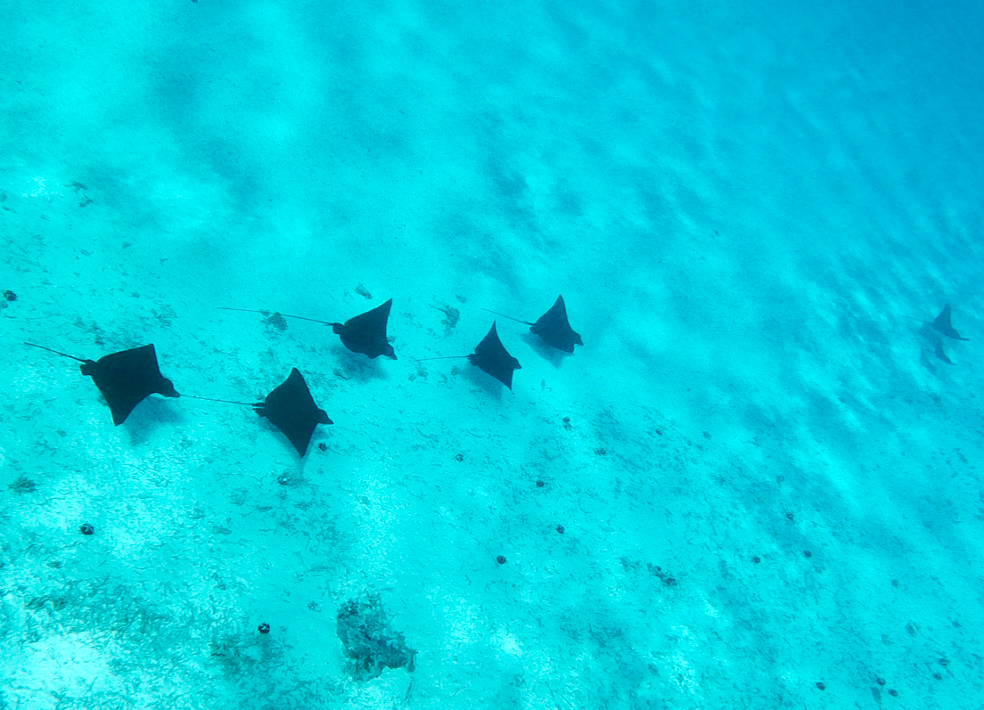 La prochaine pose sera devant le motu Taurere. Là nous assistons à un véritable défilé de raies Léopard. Ces animaux sont plus craintifs que leurs cousines Pastenague. Restons à distance et profitons de ce moment.