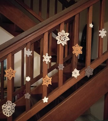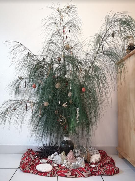 Des guirlandes de graines et coquillages, quelques branches d’Aito (l’arbre de fer) en guise de sapin, des flocons de neige au crochet avec une perle de Tahiti, des fragments de corail branchu pour faire des stalactites de glace et nous avons peint quelques paysages de montagne sur les vitres avec du blanc de Meudon. On aura presque l’impression d’être au chalet 😉 Il faut tout de même faire abstraction du bananier en arrière plan !