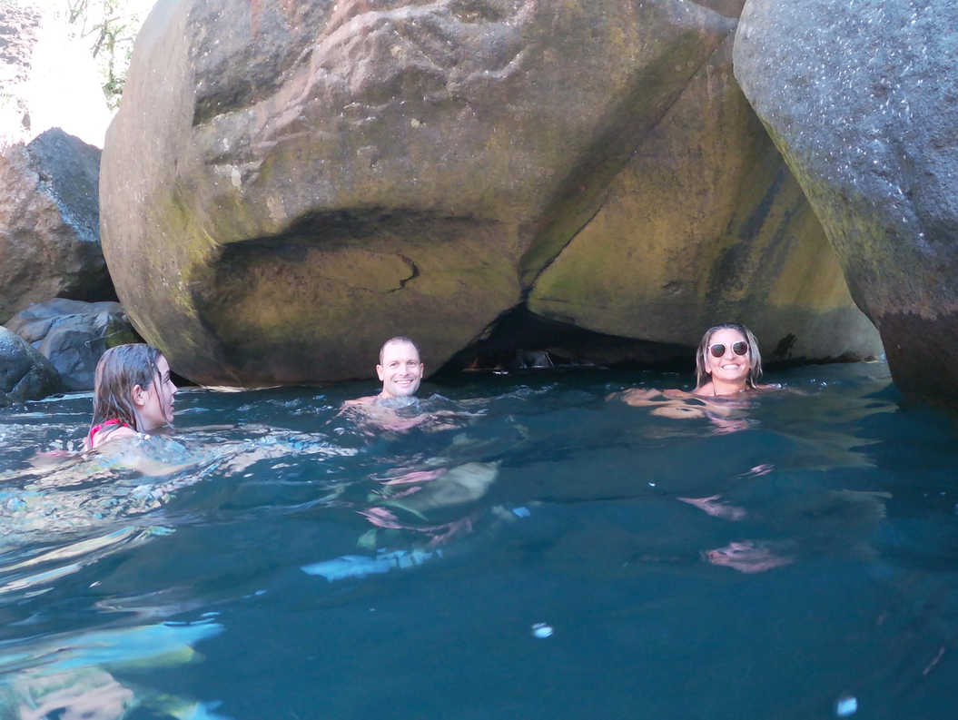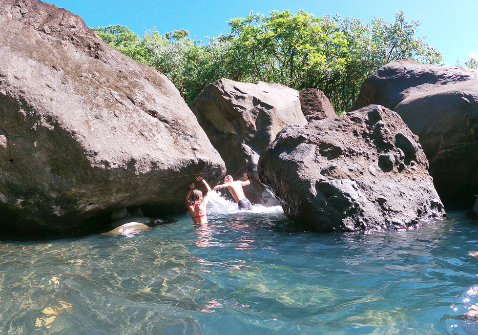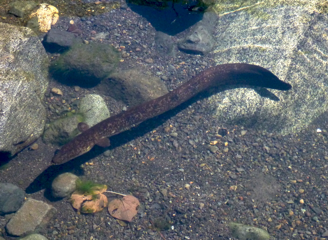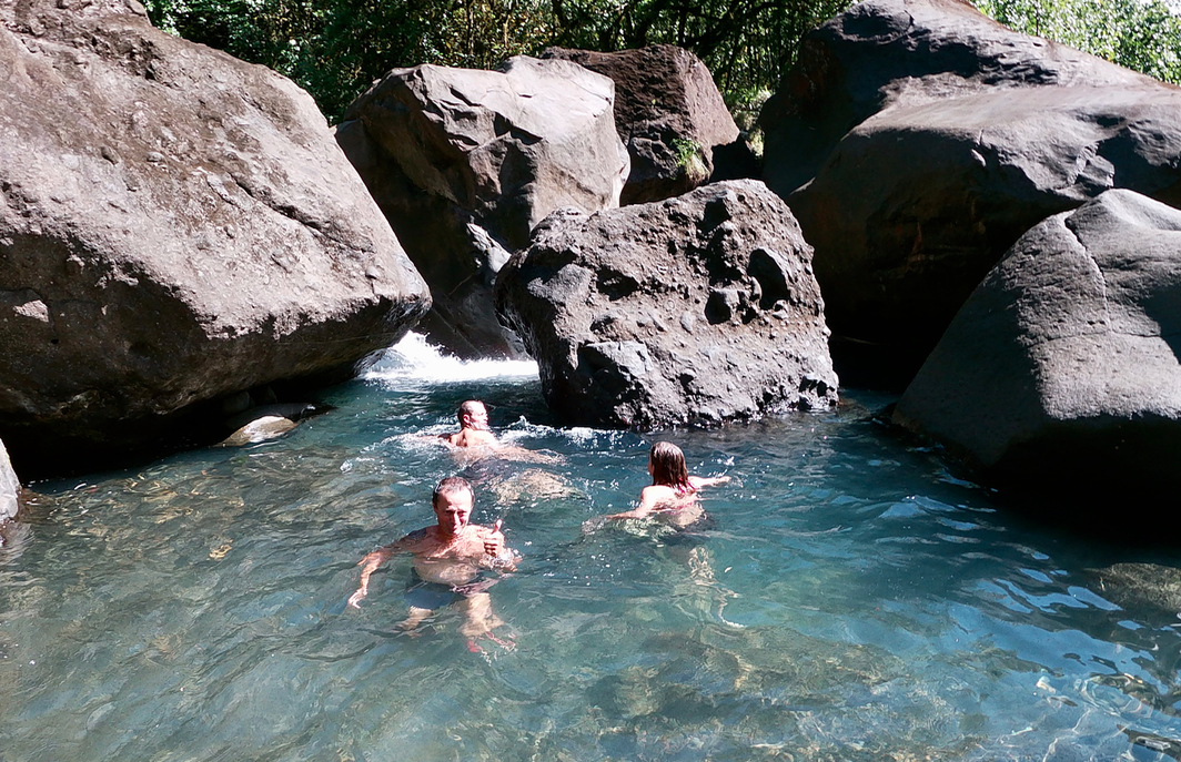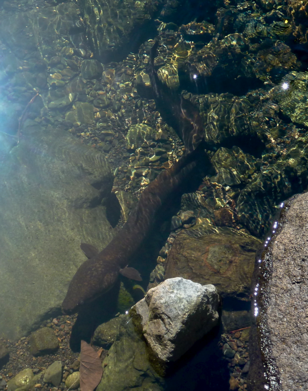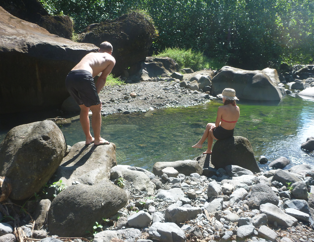 Moins de 30 secondes après avoir nettoyé les assiettes, nous voyons débarquer 2 belles « anguilles à oreilles ». Ces animaux, maintenant protégés, étaient en voie de disparition entre 1980 et 2012. Quel plaisir de les observer ! Lorsque les anguilles sont prêtes à la reproduction, elle passent au stade « argenté » ; leurs yeux deviennent bleus, les organes digestifs se transforment en organes sexuels et leurs nageoires pectorales s’agrandissent afin de nager en haute mer. C’est le moment de migrer vers l’océan, leur lieu de reproduction. Du fait des nombreux barrages, des fortes crues de 1998, de la pollution (site d’enfouissement de la Papenoo) et de la formation du barrage naturel du lac Vaihiria, les anguilles avaient quasiment disparu. Des aménagements et un relâche de juvéniles provenant le la même vallée, en 2013 ont permis d’éviter l’extinction de l’espèce.