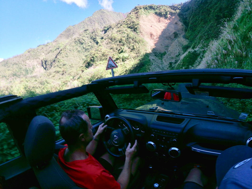 Quelques centaines de mètre avant le tunnel, nous nous trouvons face à d’autres « aventuriers » en 4×4 et découvrons que cette piste, par moment bien escarpée, est à double sens… On s’immobilise, profitant du défilé et de l’ambiance bon enfant. On est tous heureux de cette journée ensoleillée 😉 D’autres équipages restent agglutinés devant le tunnel. Toujours cette joie sur les visages ! Un superbe moment. La vue sur la caldeira est parfaite.