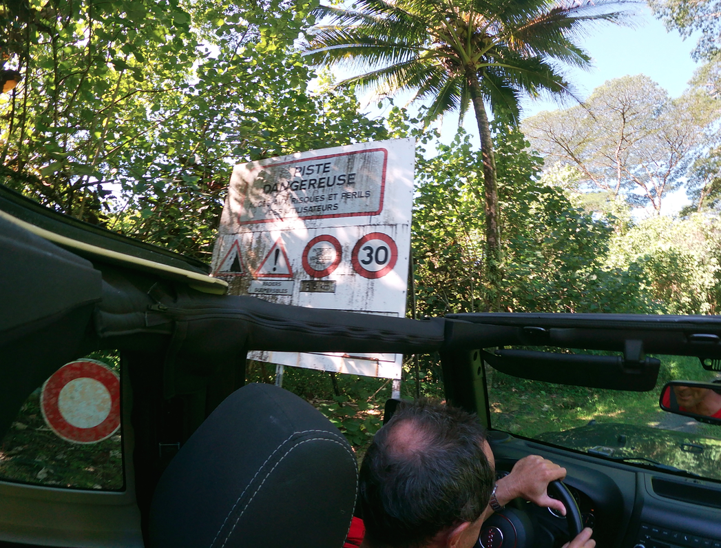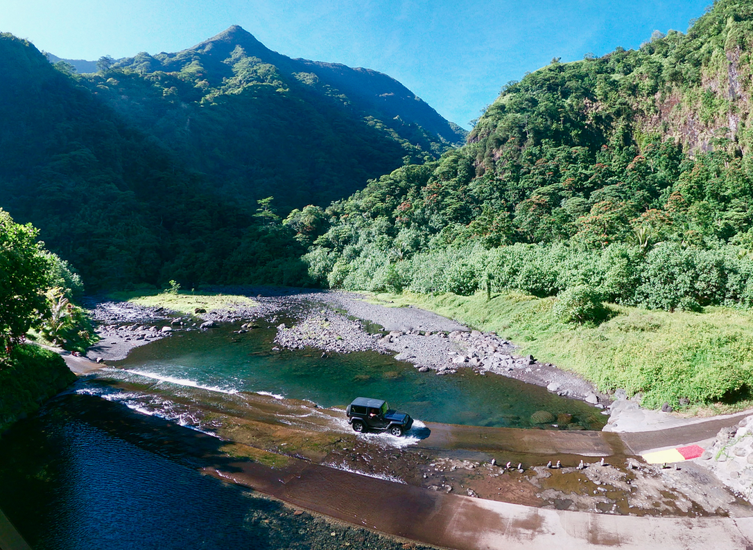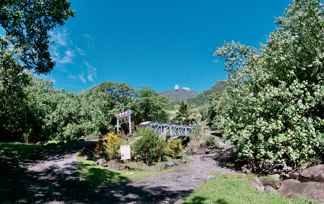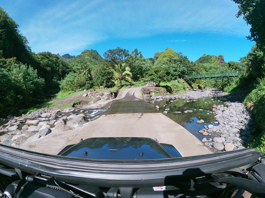 Isabelle et Laurent, équipés d’un 4×4 bien utile, passent nous récupérer. L’aventure commence au pk17. Nous nous engouffrons dans la vallée de la Papenoo, tantôt en la longeant ou en la traversant. Profitant d’un rayon de soleil sur le premier gué, on sort prendre quelques photos de cette superbe vallée. Le panneau d’entrée du parc classé de la vallée de Faaiti nous attire… mais ça ne sera pas pour aujourd’hui ! En voisins, nous aurons l’occasion de revenir.