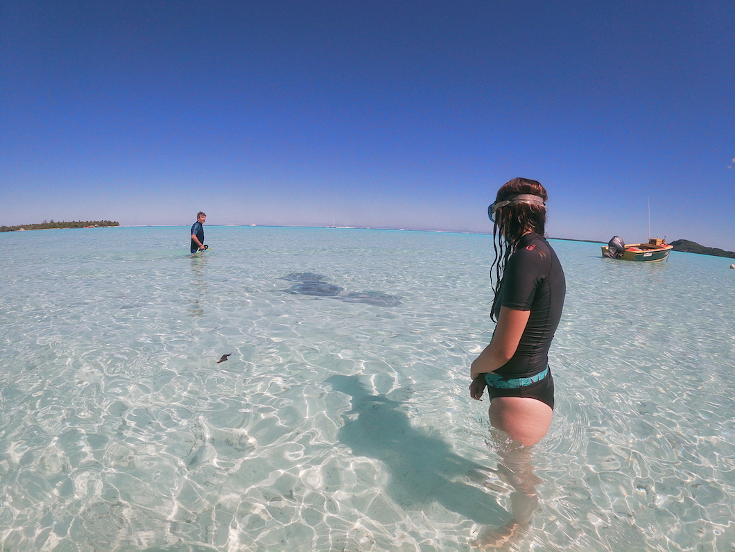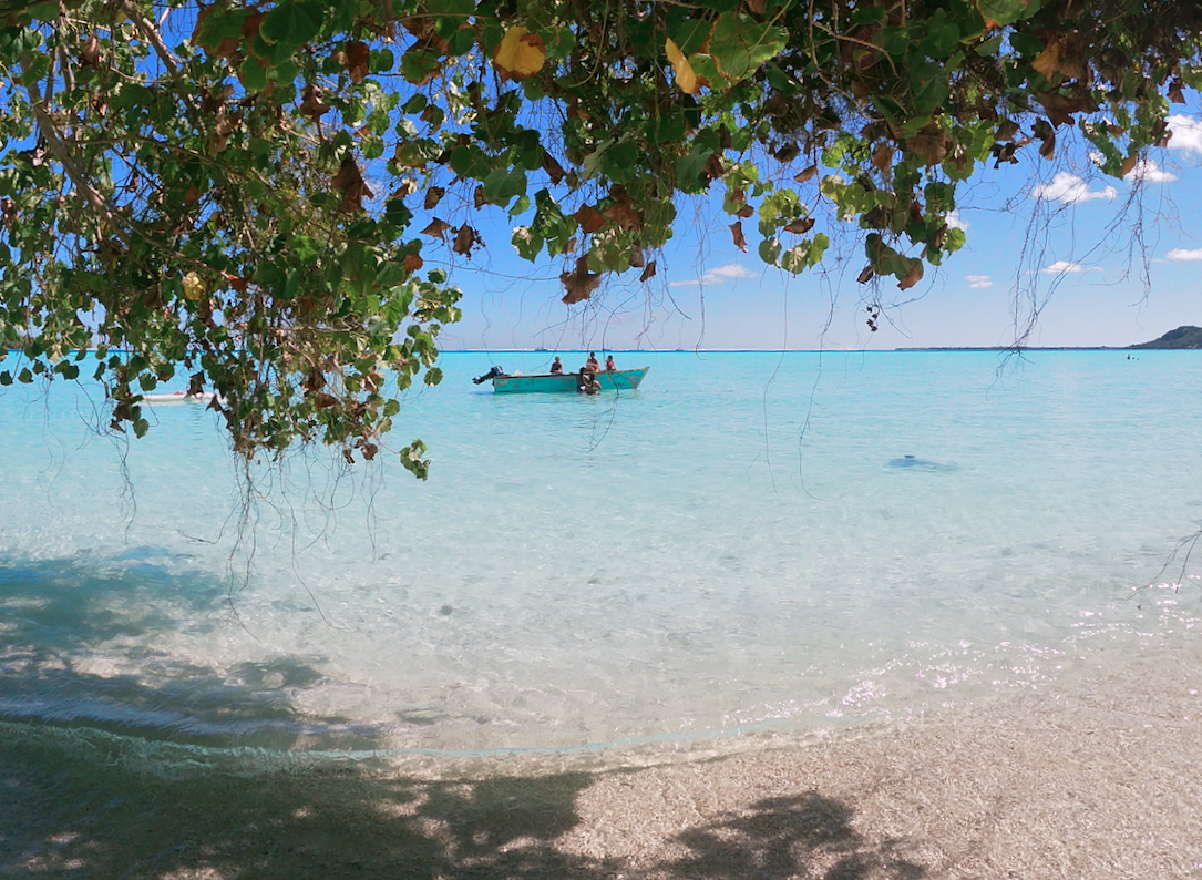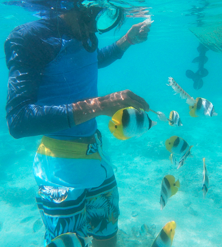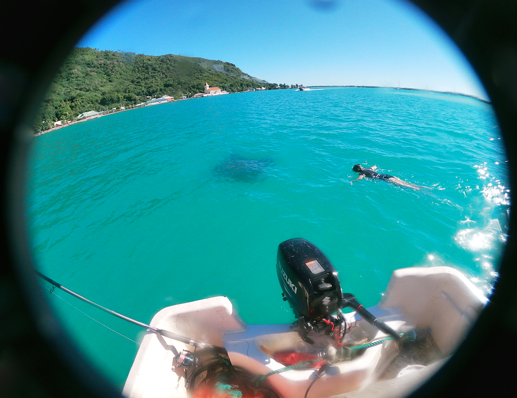 Chaque samedi, un four traditionnel est organisé sur le motu voisin (Tiapaa). C’est l’occasion pour les locaux de se retrouver et pour les touristes, de découvrir ce mode de cuisson typique de la Polynésie. Décision est prise de profiter de cet évènement pour faire une sortie pêche et rencontre avec les Raies Mantha.