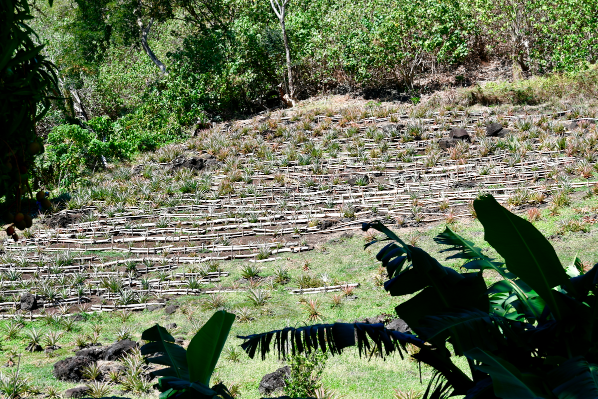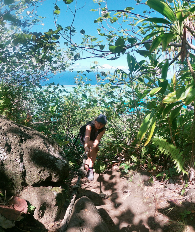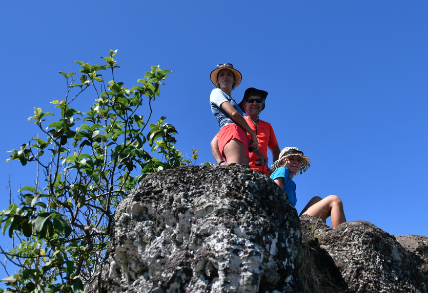 Pris de remords, on se lance à l’assaut du Mont Teurafaatiu culminant à 372m, c’est une épreuve sous cette chaleur. Nos invités n’étant pas acclimatés, nous progressons tranquillement. Bon, il faut avouer que l’on a, au final, fait la radio 2 fois. Une légère erreur d’aiguillage en début de parcours nous a envoyé sur un mauvais chemin. Têtus, nous avons eu du mal à redescendre jusqu’en bas 😉 Un conseil, à la dernière maisonnette prenez à gauche juste devant. Ne suivez pas le chemin bien tracé de l’antenne. L’effort est largement récompensé le lagon est remarquable.