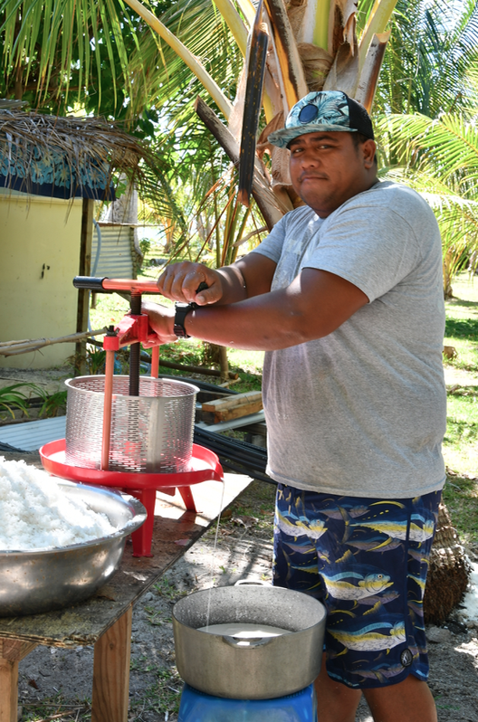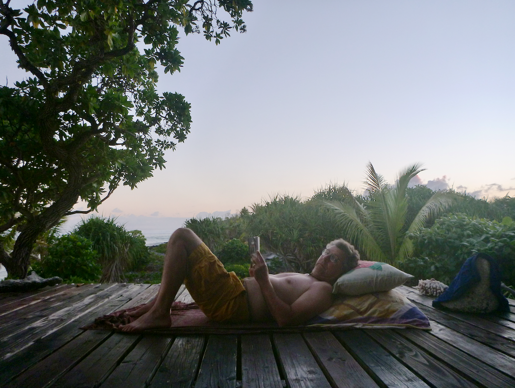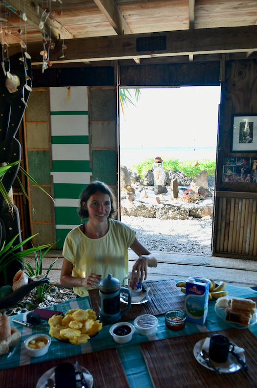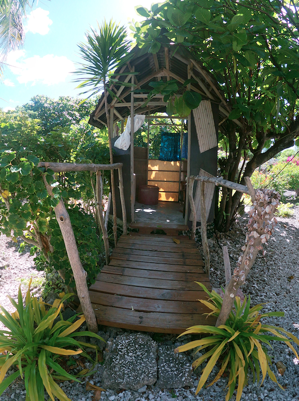 Le passage à la douche est tout aussi dépaysant. Toujours pas d’eau courante ni de pommeau de douche. L’affaire se règle avec une coque de noix de coco. Bien entendu, l’eau est froide et légèrement saumâtre. C’est tout à fait normal sur les atolls ou les motu.