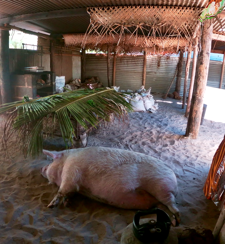 Il est maintenant temps de passer aux choses sérieuses : Le four Traditionnel. De bonnes âmes l’ont allumé alors que nous n’étions encore qu’au p’tit dèj. Nous n’avons plus qu’à attendre l’ouverture et en profitons pour prendre l’apéro. Quelques Raies Pastenague viennent s’assurer que les restes leurs seront bien offerts et Lylou fait la connaissance d’un cochon très malheureux.