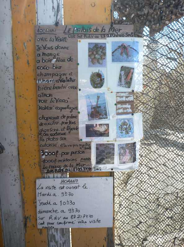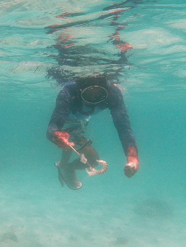 Notre prochaine étape sera la pêche des Squilles que nous mangerons le soir même. Le concept me plait bien. Curieuse, je ne lâche pas Ura d’une savate. Il faut être sacrément patient pour attraper ces petites bêtes. De plus, les pattes avant de l’animal sont tranchantes comme des lames de rasoir. Mieux vaut observer l’expert que d’y laisser un doigt. Ura cherche un trou dans le sable « bien entretenu ». Il y enfonce une baguette avec une sorte de goupillon au bout et un morceau de chaire poisson. Au bout de quelques temps le squille (ou Varo en polynésien) s’accroche et Ura n’a plus qu’à récupérer l’occupant.