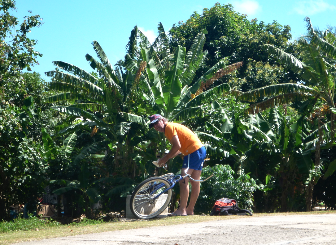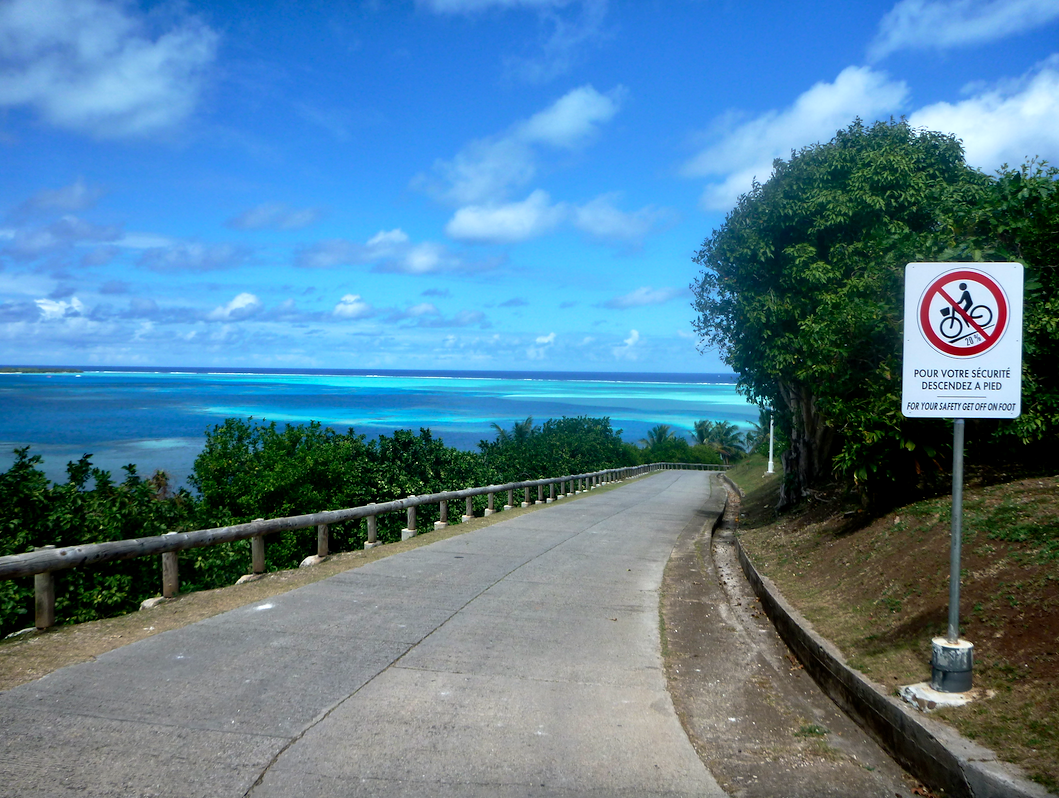 Pas encore tout à fait rassasié, le lendemain on réserve des vélos pour faire le tour de l’île principale. Les pensions de l’île sont pleines et il faut croire que tout les touristes se sont donnés rendez-vous à Maupiti. Bien entendu, nous avons tous voulu louer un vélo le même jour… On récupère les derniers. Dont un, plus que douteux. Daniel aura l’occasion de tester ses talents de réparateur à plusieurs reprises. Ah les vélos des îles. 40kg, pas de freins et encore moins de vitesses. Du pur bonheur ! Une autre info pour ceux qui souhaiteraient passer au palais de la mer : c’est fermé le lundi. Bon du coup on a juste eu le droit au panneau. On râle mais on s’est bien régalé. Avec pour terminer, LA plage paradisiaque par excellence. Il est possible de rejoindre le motu en face à pied. Cependant il faut compter 1h30 allez-retour.