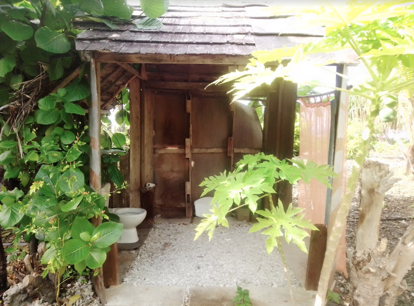 Alors, comme je vous l’expliquais, l’eau est précieuse. Donc quand vous partez aux toilettes, vous emportez un sceau d’eau ou sinon vous choisissez les toilettes sèches. On a compté 6 WC sur le terrain. Il y en a un peu de partout, plus ou moins cachés. Là aussi, pour l’intimité vous reviendrez. Pas une seule porte à la cabane, ça vaut aussi pour les toilettes. Bon nous, ça nous a plutôt bien fait rire.