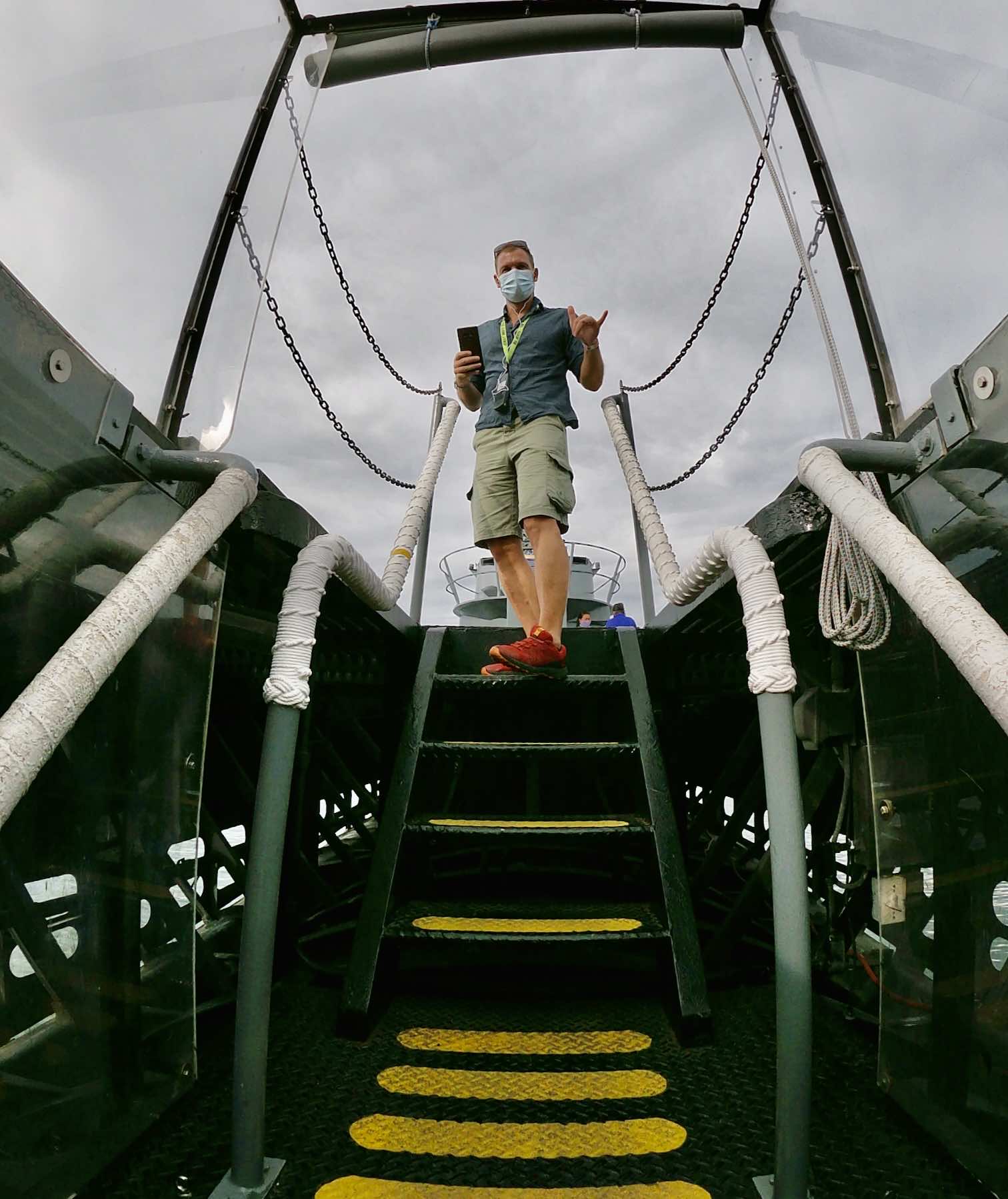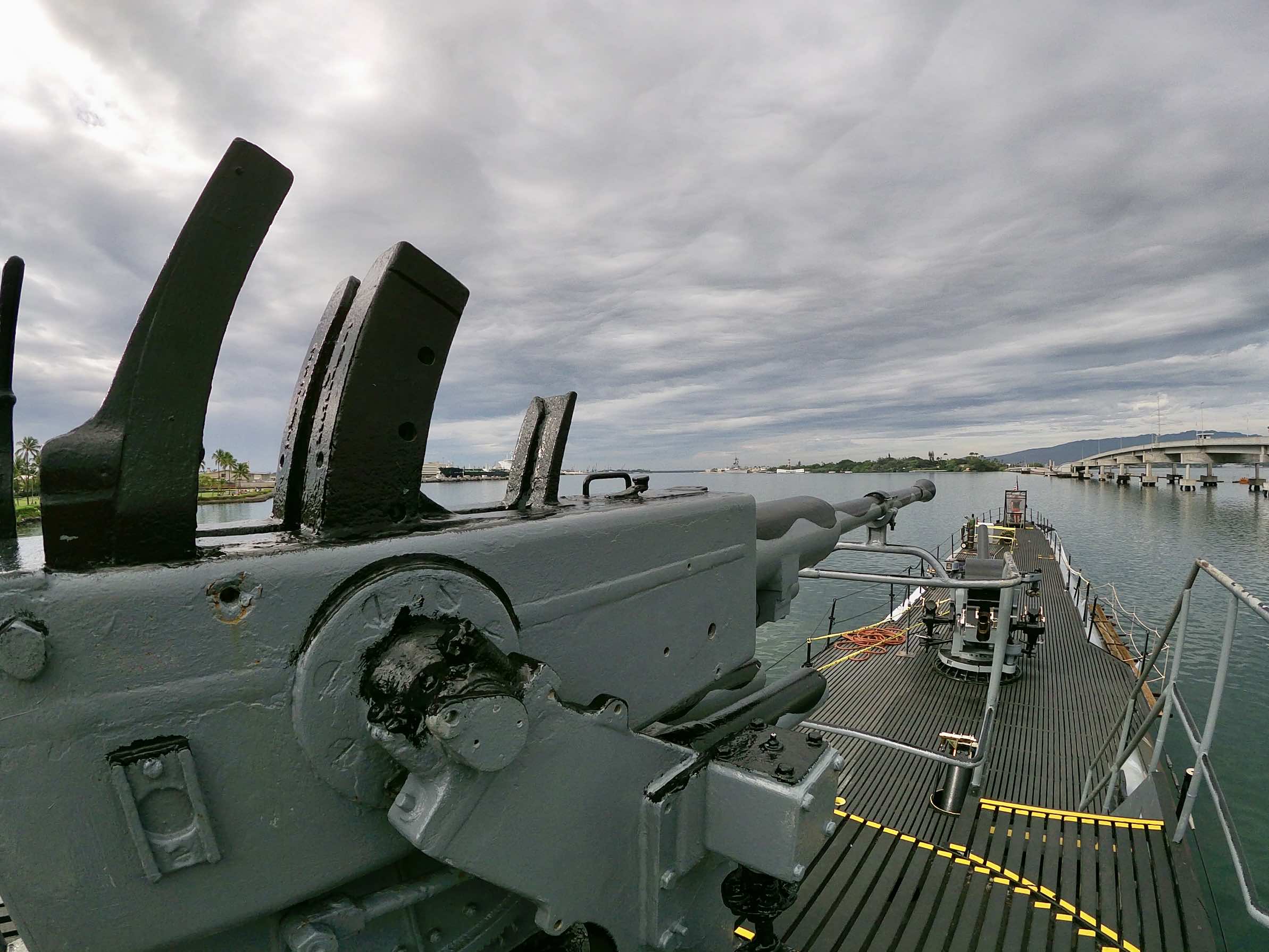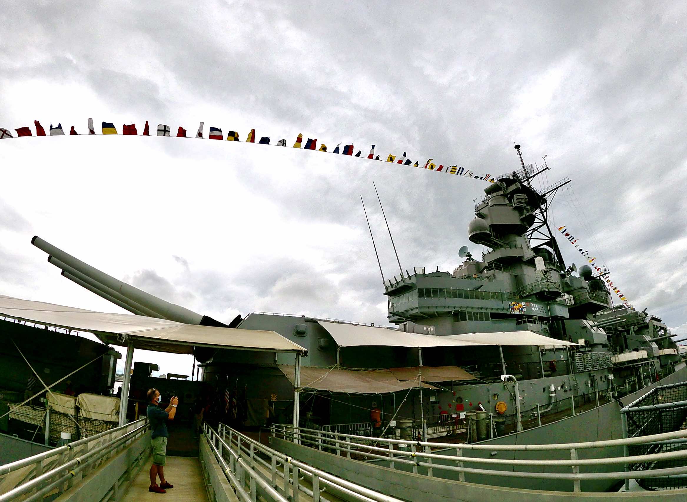On l’avait déjà repéré ce matin depuis le parc du mémorial mais une fois sur le quai, on se trouve face à un monstre. Son petit nom : « Mighty Mo ». Nous avons la chance de le découvrir quelques jours avant les cérémonies commémorant l’attaque de Pearl Harbor. Le bâtiment est orné de fanions et drapeaux. Sur ce site aussi, nous croisons peu de touristes mais les vétérans (surpris de voir des français) sont biens présents pour nous raconter l’histoire du navire et de la Navy.