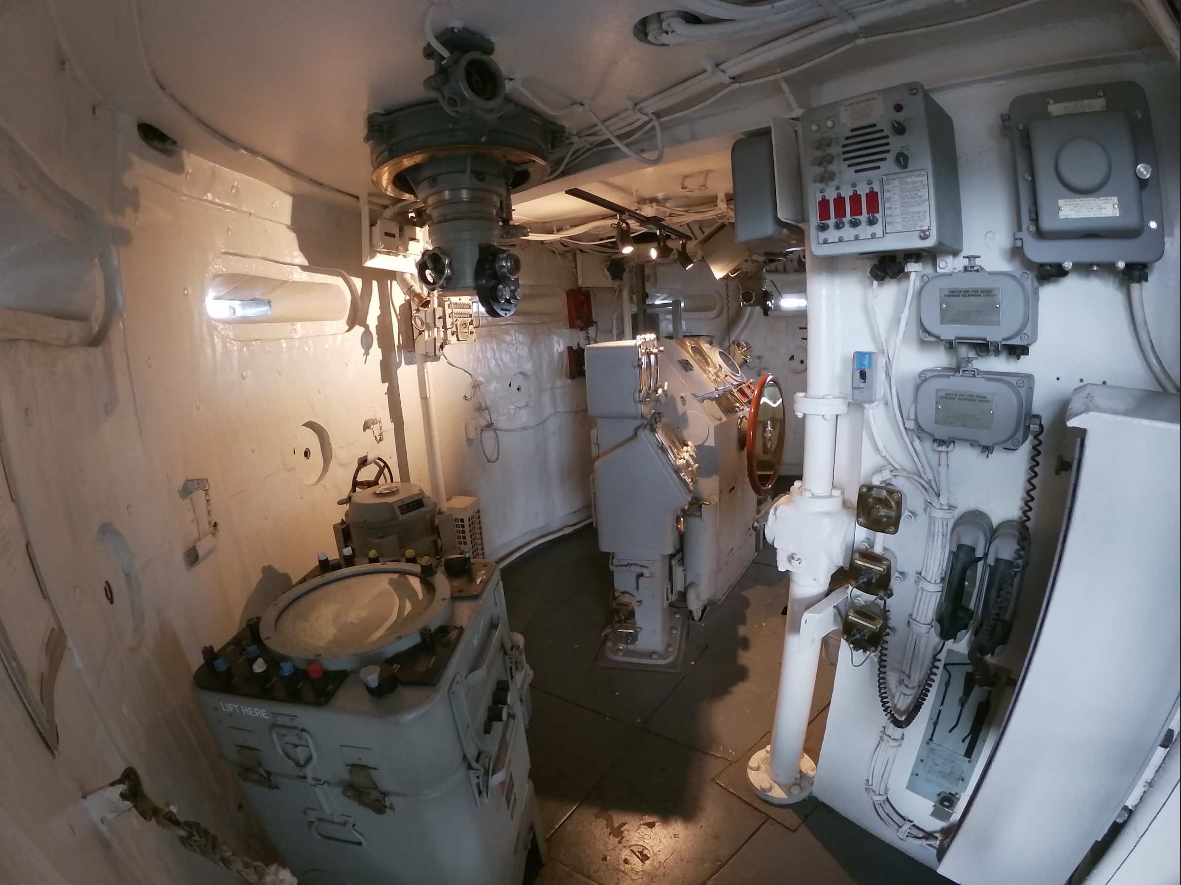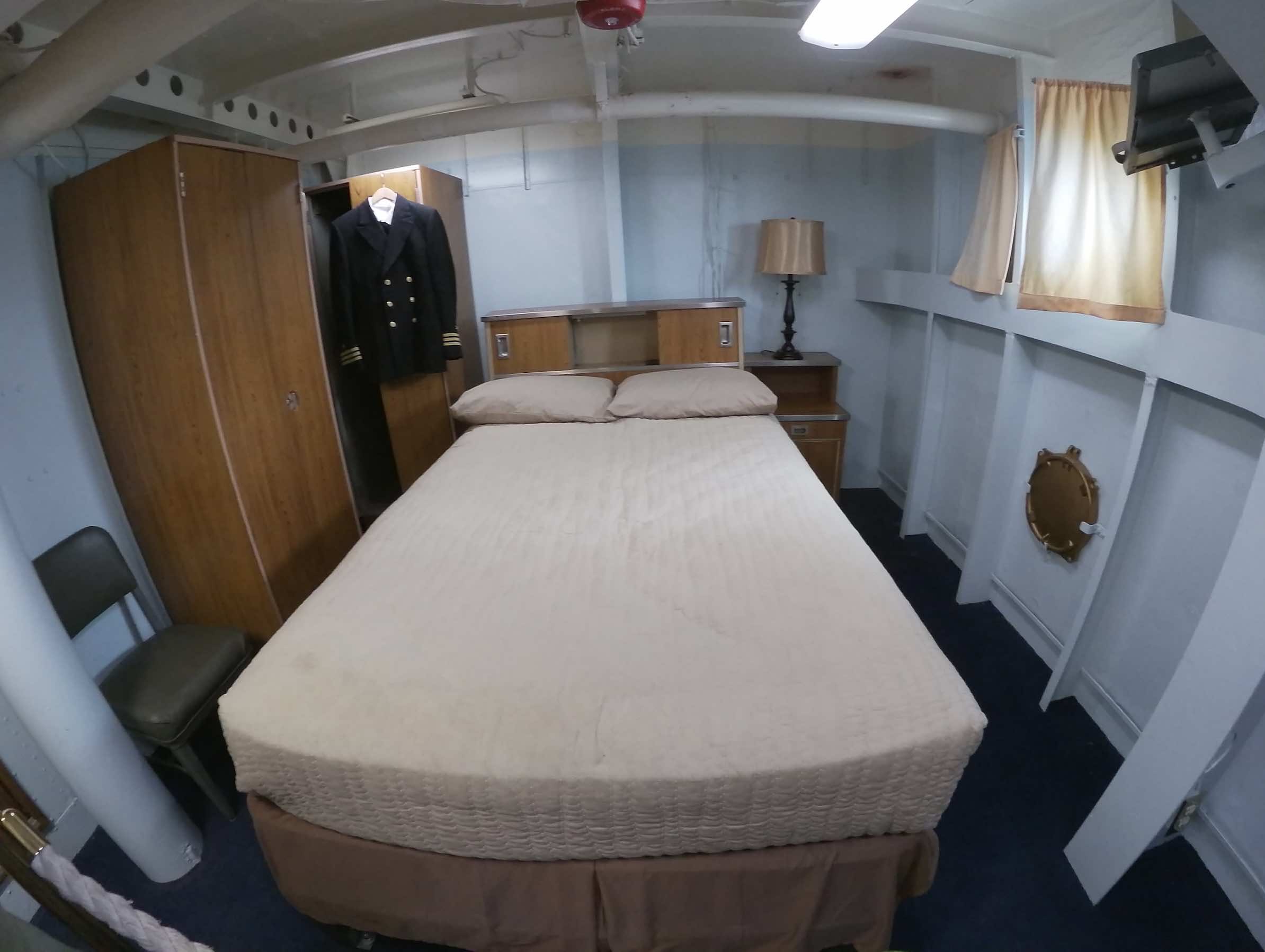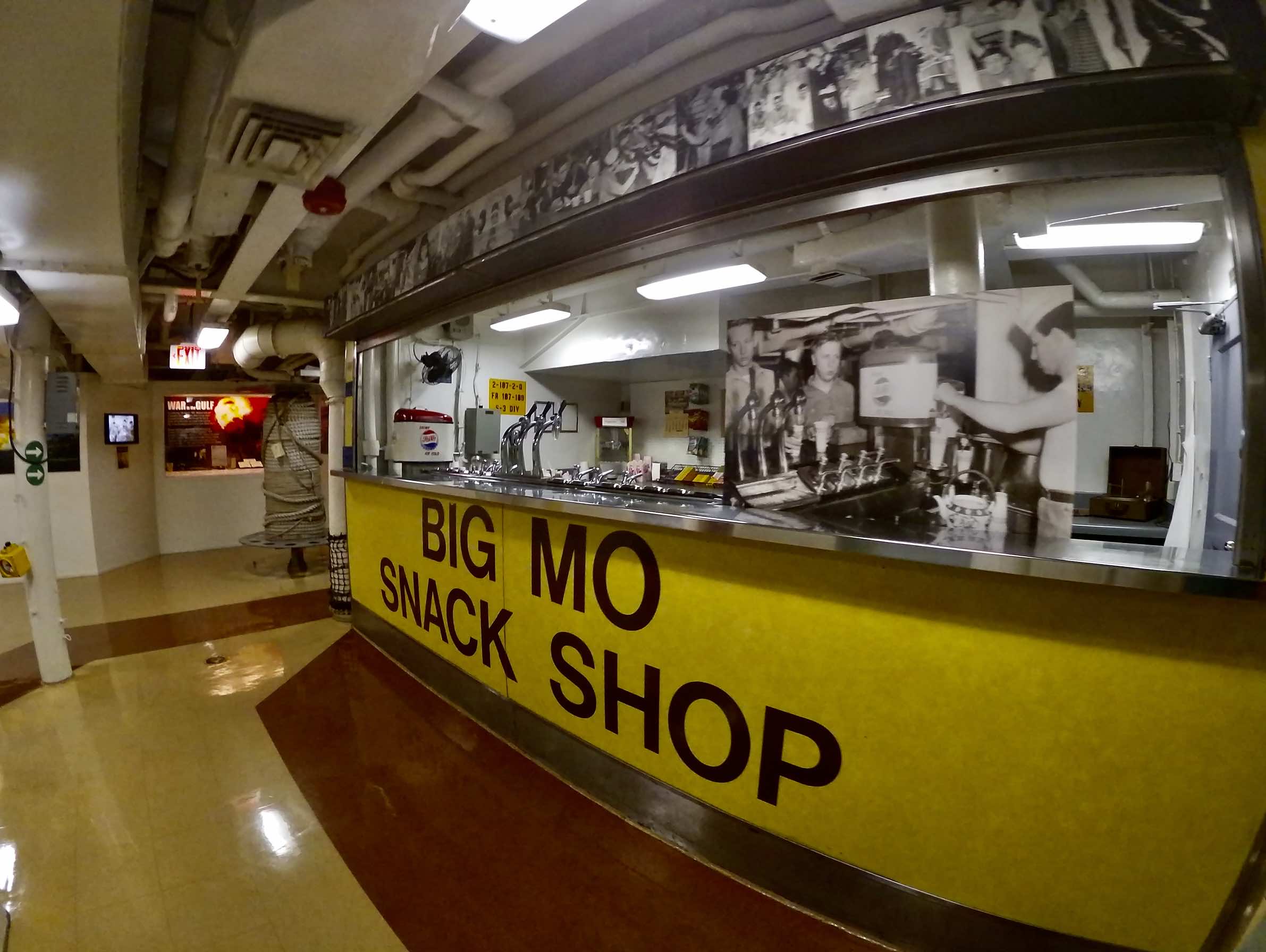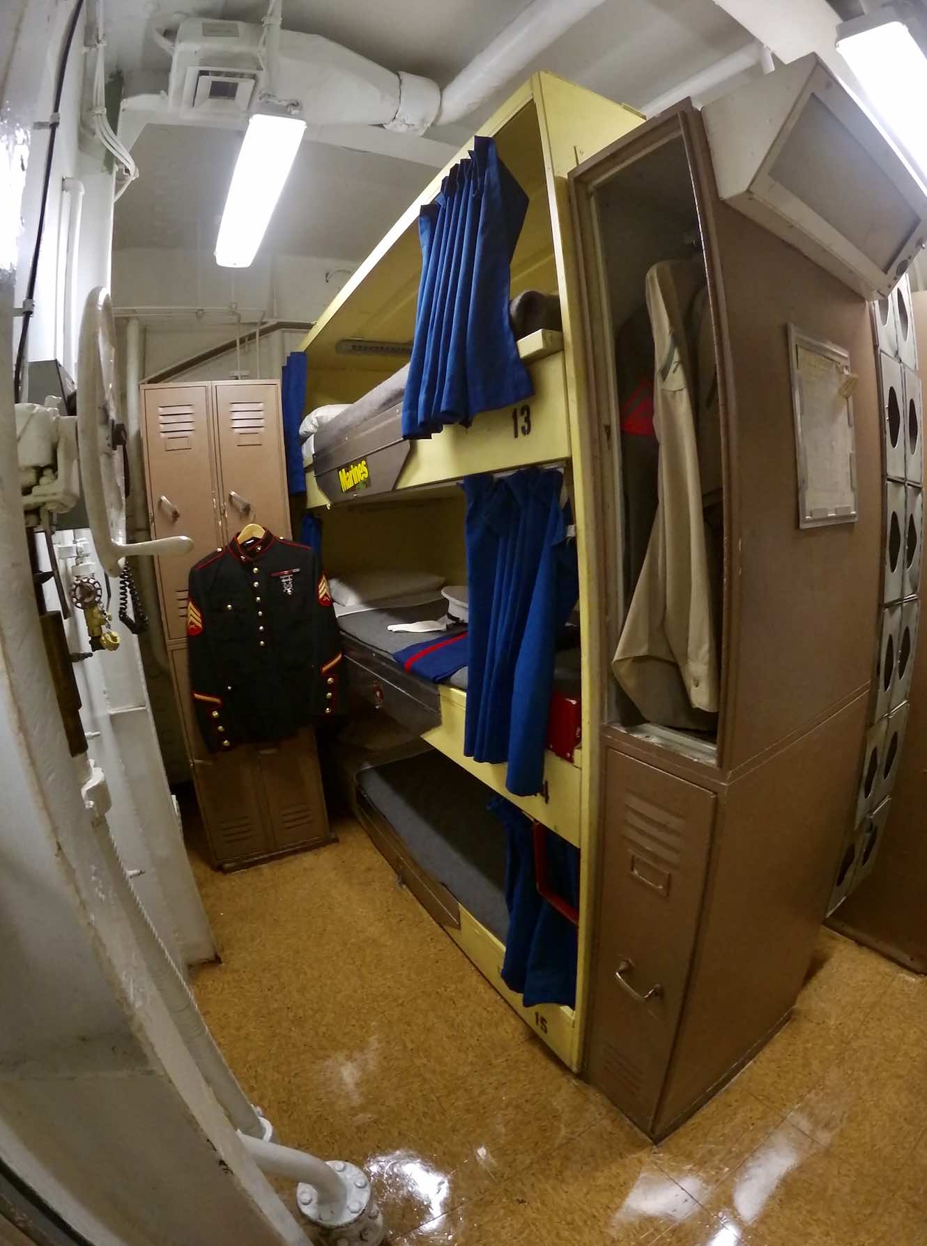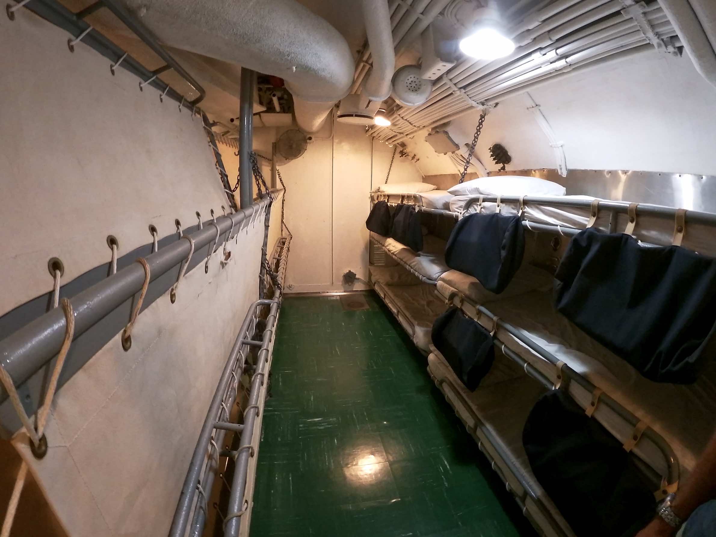 La visite du cuirassé est assez longue, nous avons accès à de nombreuses pièces. La vie des marins est plus agréable que dans l’USS Bowfin mais la promiscuité y est encore bien présente. Des munissions passent au milieu des dortoirs et si vous êtes simple marin, ne cherchez pas l’intimité. C’est simple, il y a des couchettes de partout ! Par contre, on trouve à bord de nombreux snacks, boulangerie et restaurants, salle informatique, bibliothèque, clinique dentaire, poste…